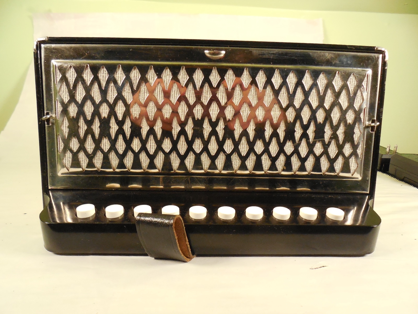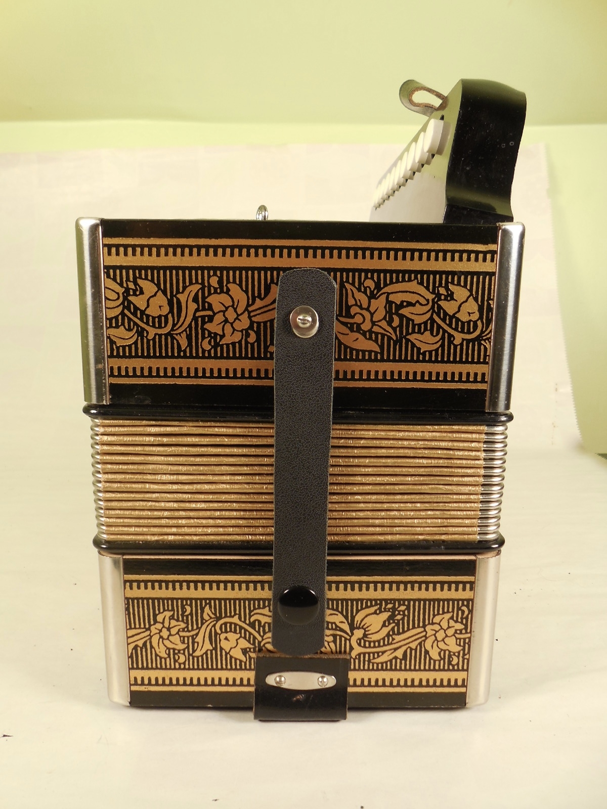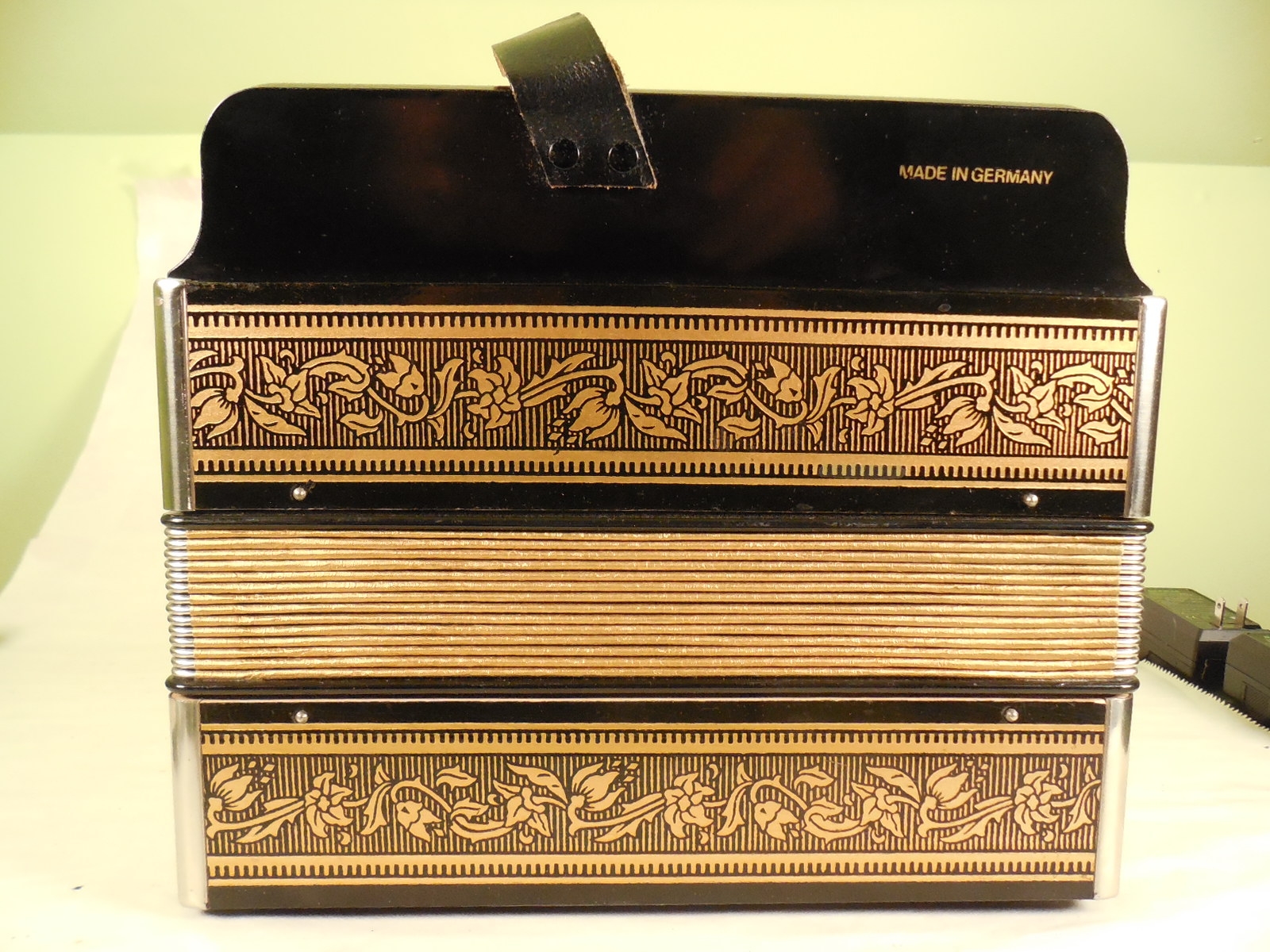 Hohner button accordion in the key of G, just tuned. It is rare for me to find a used instrument that is so close to new. This was made in Germany in the Hohner factory. It is in mint condition. The black and gold painted wood case is in excellent shape shows very slight wear for an instrument of this age. The original bellows are airtight and have orange colored papers and black taped edges. It has 10 treble buttons and 4 bass buttons.