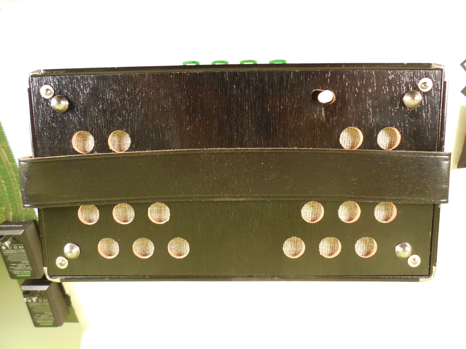 I have improved the instrument by added button travel limiting on the treble side. The buttons stop near the top of the keyboard instead of disappearing far down into the hole- a design flaw on Pokerworks. Another improvement did while the keyboard was off is I have chamfered the sharp corners on the button holes. Just makes it nicer on the fingers when playing.