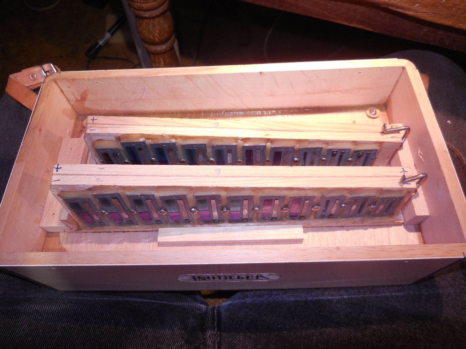 The bellows gaskets have been replaced. The straps are worn but functional so they have been left in place.The wooden keyboard is intact with very little wear. Often there are cracks or entire sections missing between keys on some of these old Hohners. The original thumb loop in in place but I have added shoulder strap brackets. I have just tuned all 144 reeds. On the treble side the tremolo beat frequency is around 1 Hz for the lowest notes gradually rising to 6 Hz on the upper notes. The original leather one way valves were all removed and replaced with modern plastic one way valves for long trouble free life. All reedplates were removed, cleaned, one-way valves replaced and remounted & rewaxed onto the reedblocks. Final tuning occurs in situ with the reedblocks inside the case.