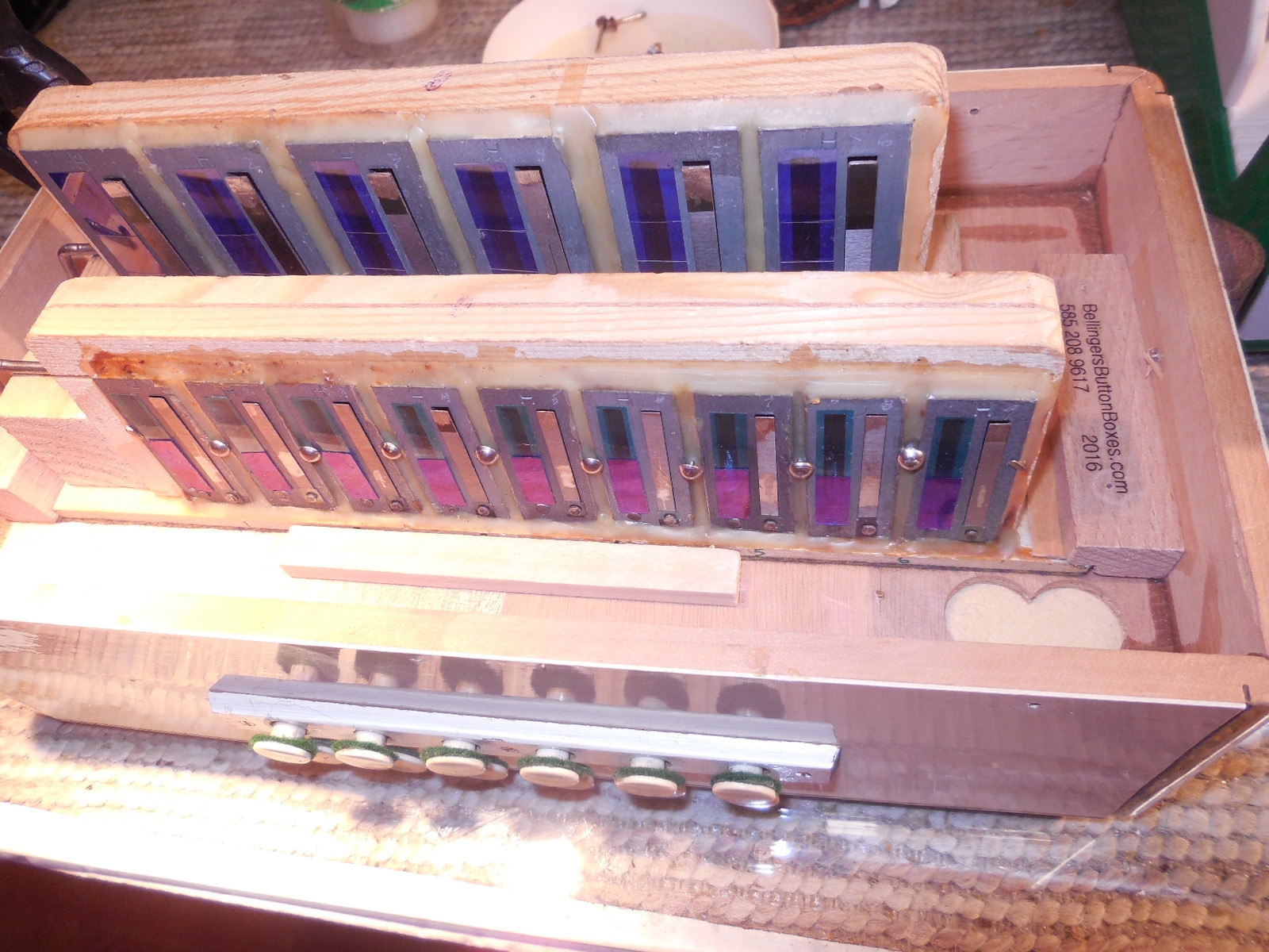 The 12 basses are fairly unusual and add nice variety including two additional minor chords. The buttons were originally arranged in a staggered configuration. One row has been shifted so they are now inline as modern instruments are configured. These are particularly resonant.