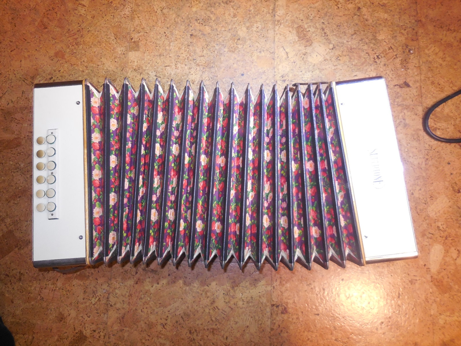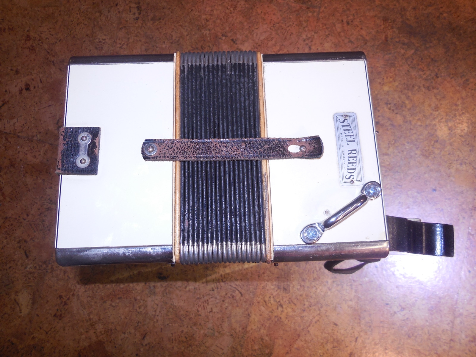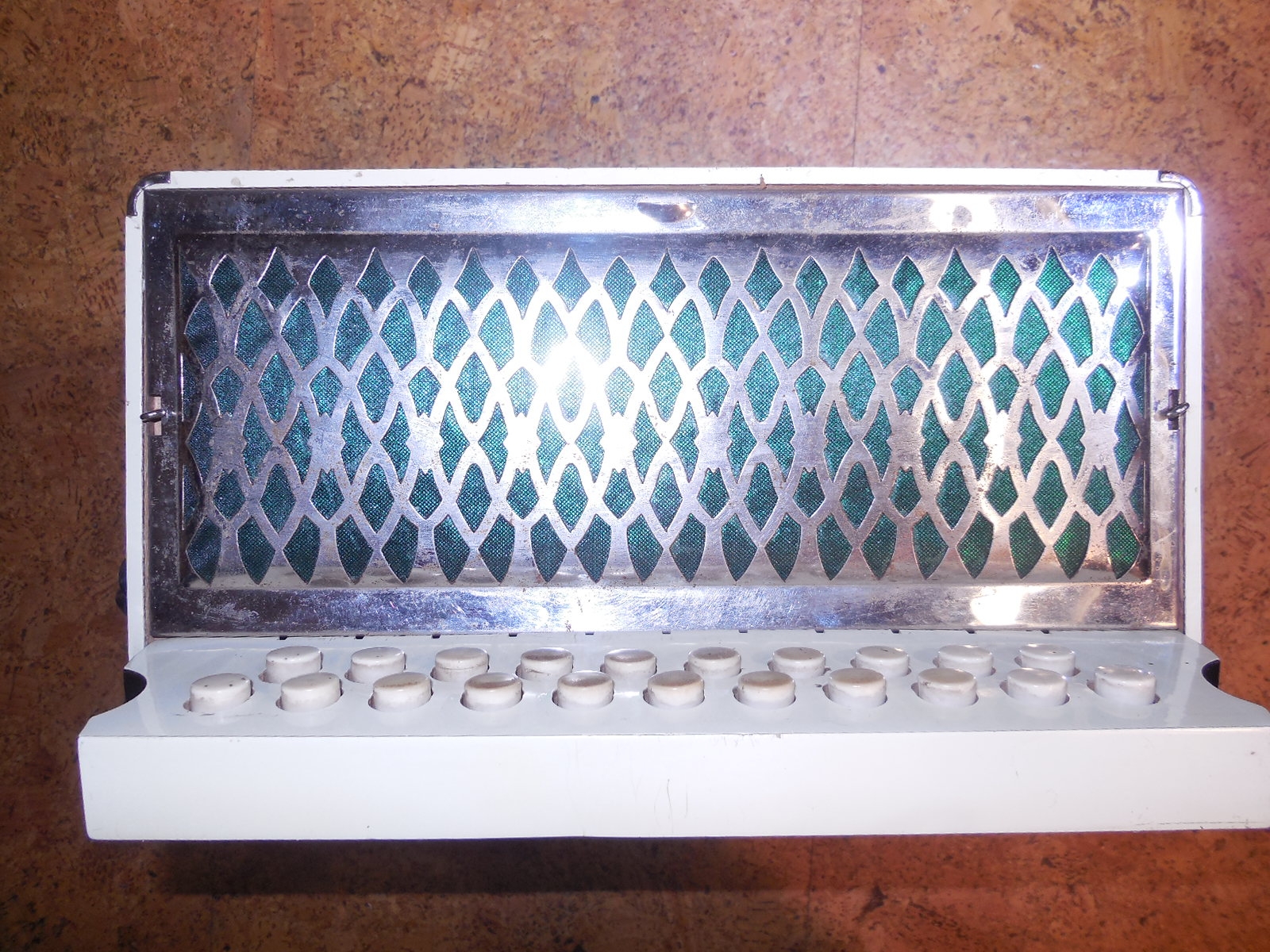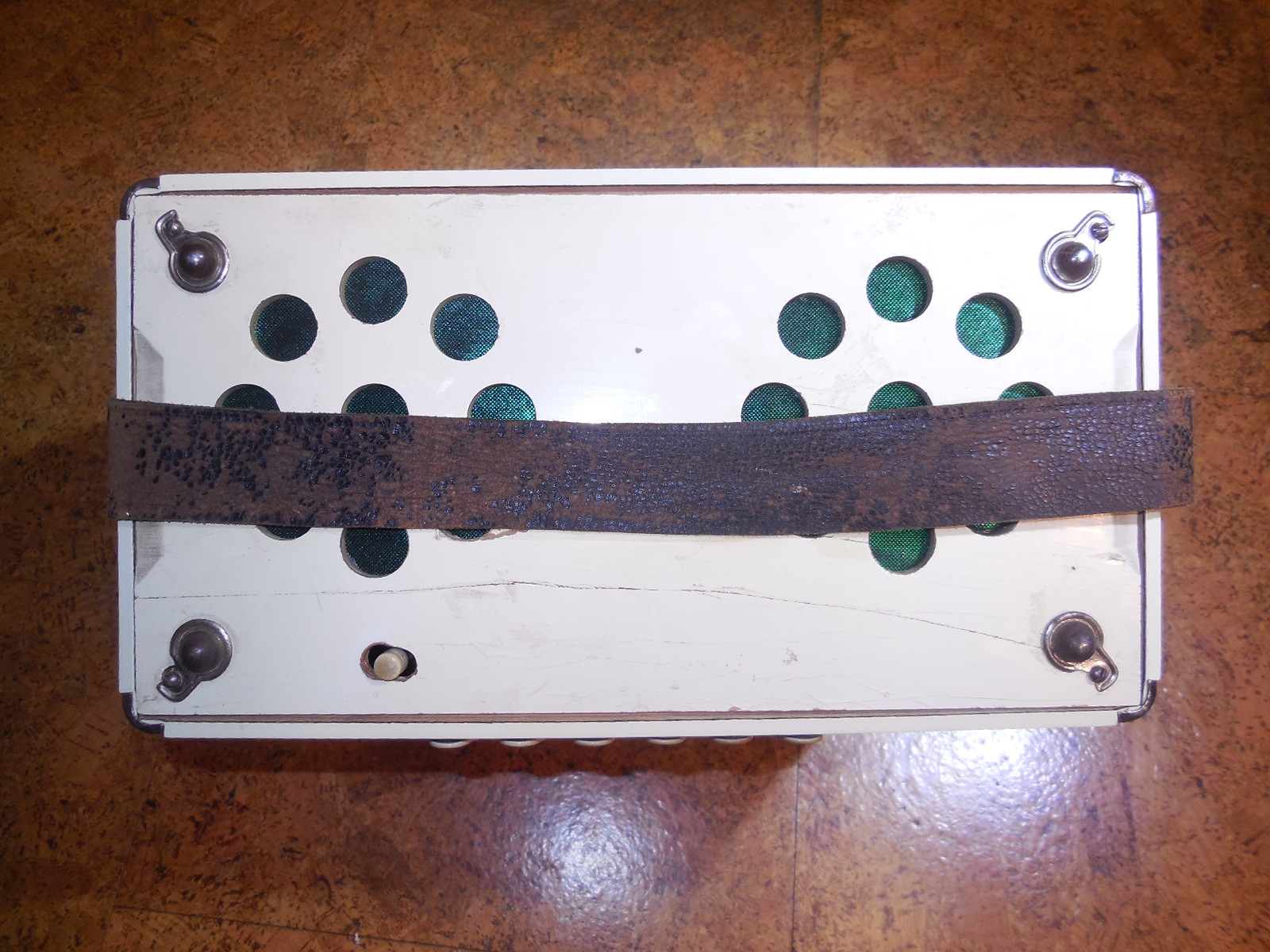 Excellent Supertone button accordion made in Germany in the Hohner factory. It is in very good condition. There is little wear anywhere. The white plastic covered wood case is in great shape. The original bellows are tight. Some wear to the bellows tape but it has been retaped where needed. They feature very colorful papers. It has 21 treble buttons and 12 bass buttons. The low buttons on each row of the treble side are the standard Hohner accidentals. The zinc reed plates have the ‘H’ marking on the treble, chord and bass reeds. It has steel reeds. This has had extensive restoration. The pads have been redone using felt backed leather. This quiets the action and provides good sealing. The treble button travel has been limited so that the buttons don’t disappear down into the holes but stop near flush. The back has a new grill cloth. The back is solid wood, not plywood, and had cracked so I have reglued it.