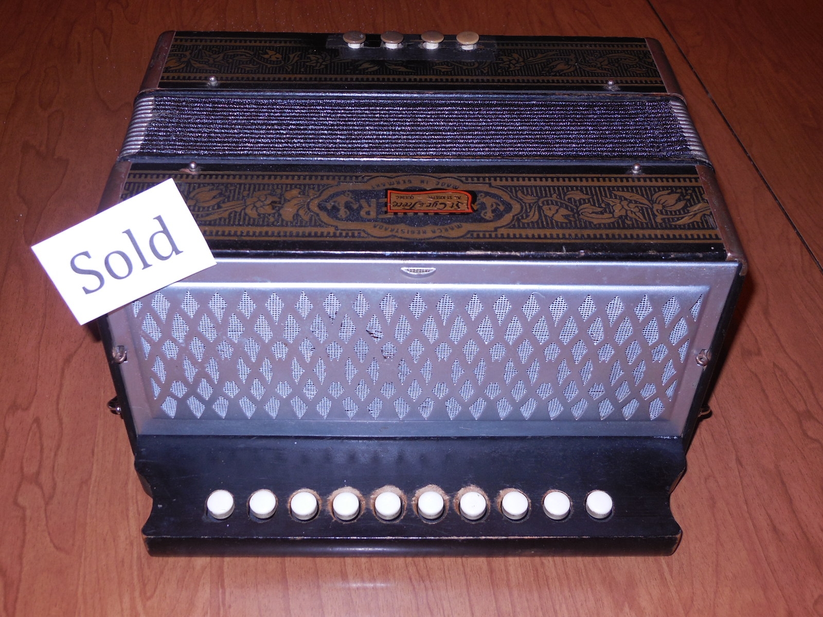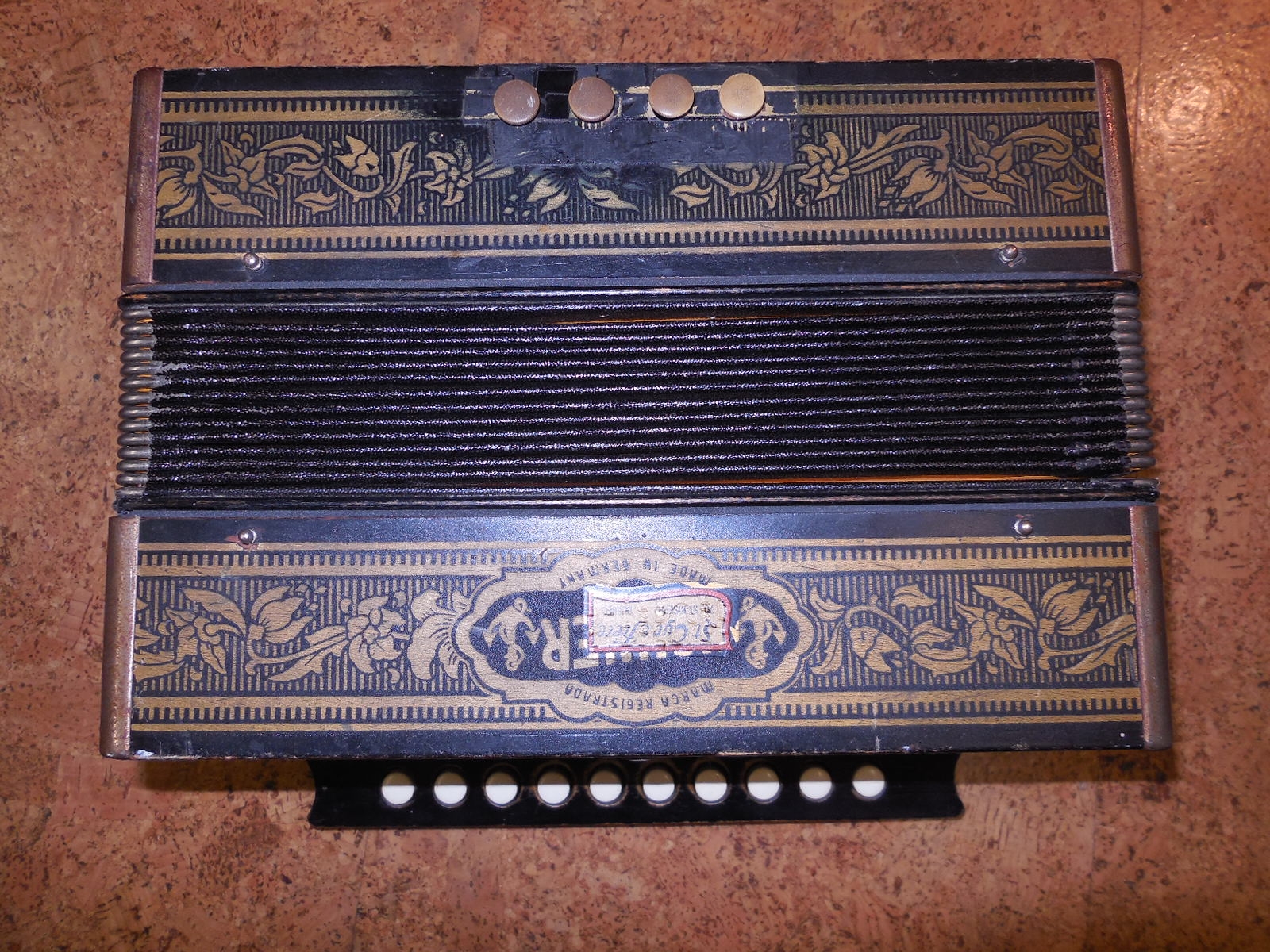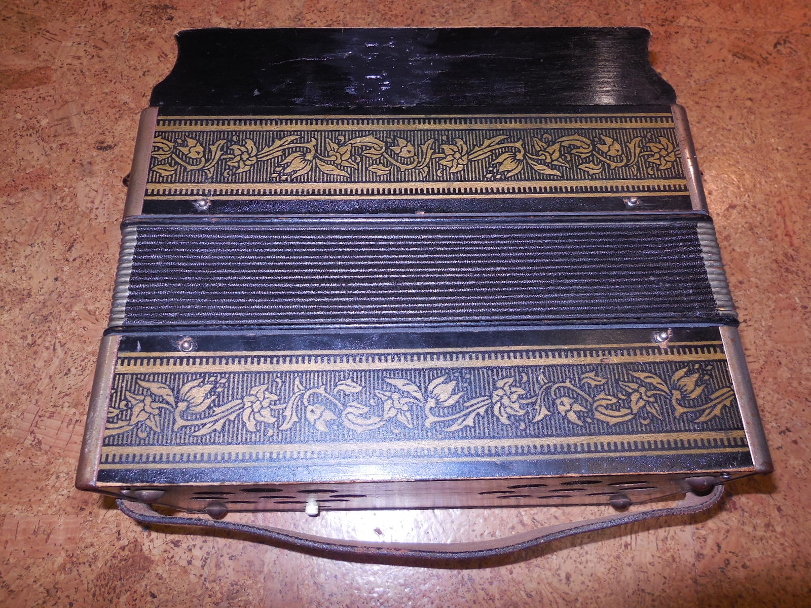 Restored Hohner button accordion in the key of C. This was made in Germany in the Hohner factory. It is in good condition overall. The black and gold painted wood case is in good shape but shows normal wear for an instrument of this age. The original bellows are airtight and have yellow colored papers and black taped edges. It has 10 treble buttons and 4 bass buttons. The treble, chord and bass reeds are steel on individual aluminum plates and have the ‘H’ or ‘T’ marking.