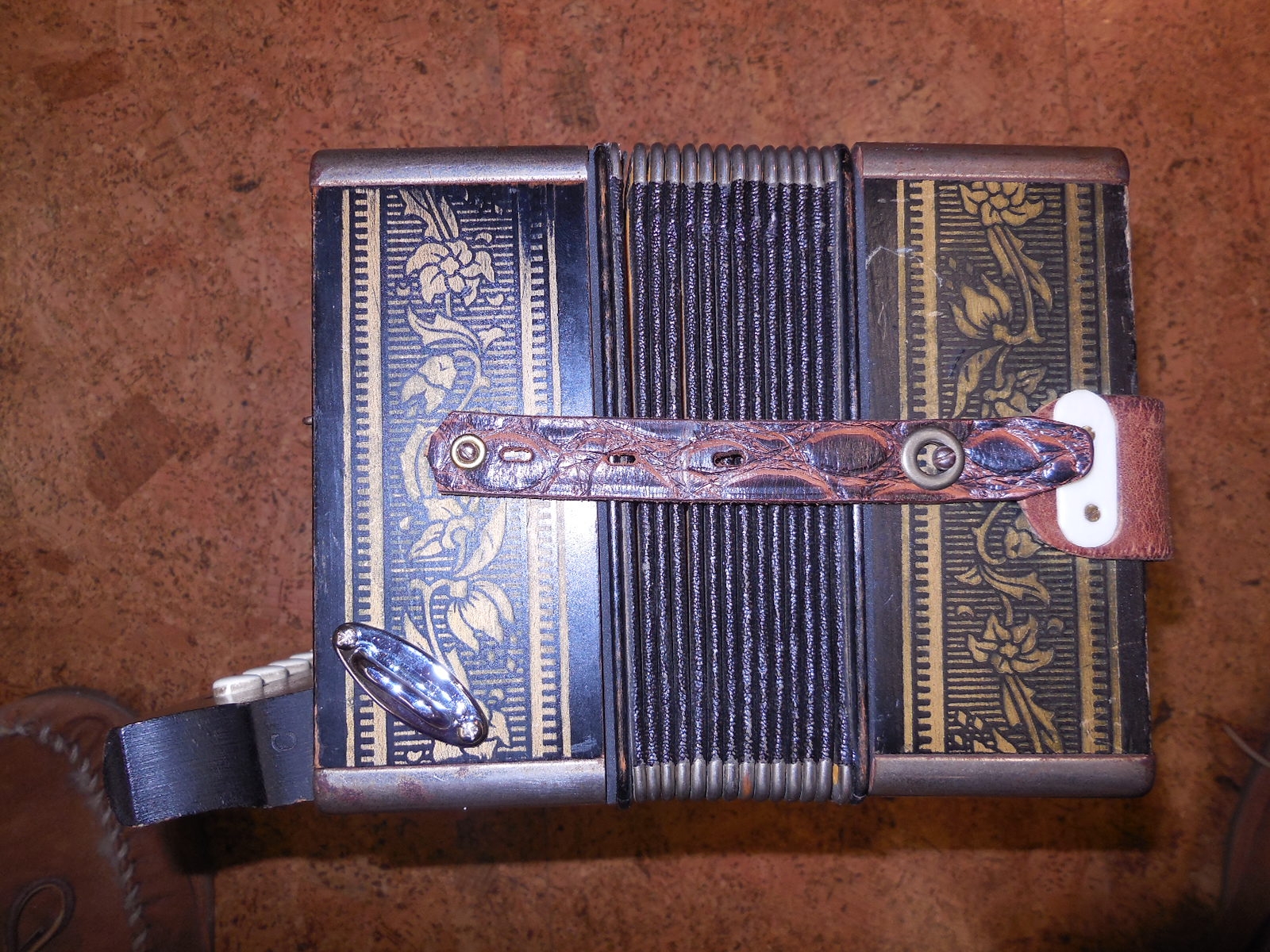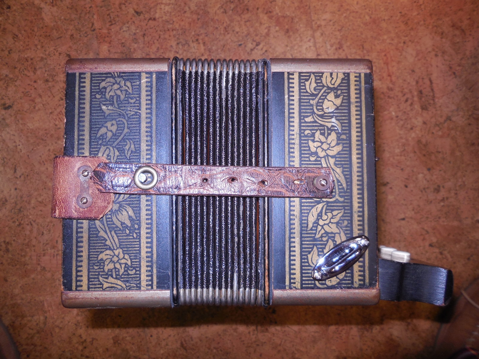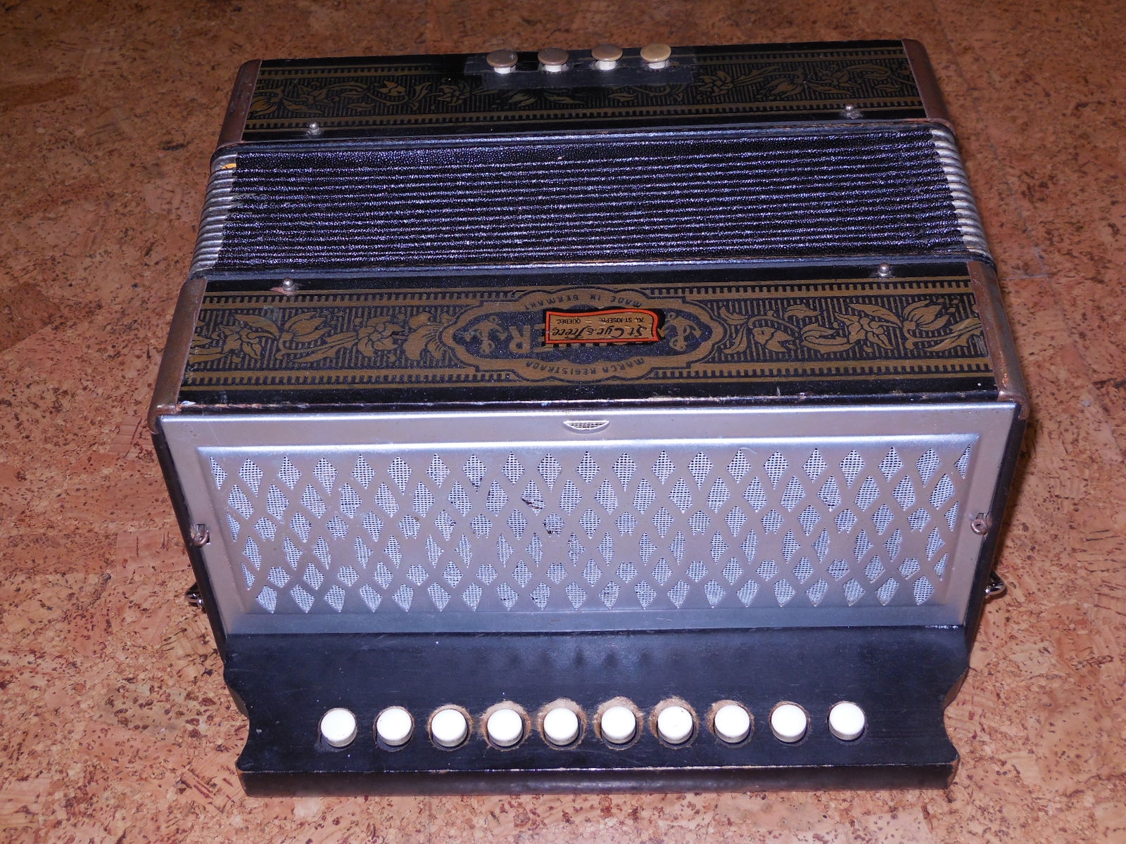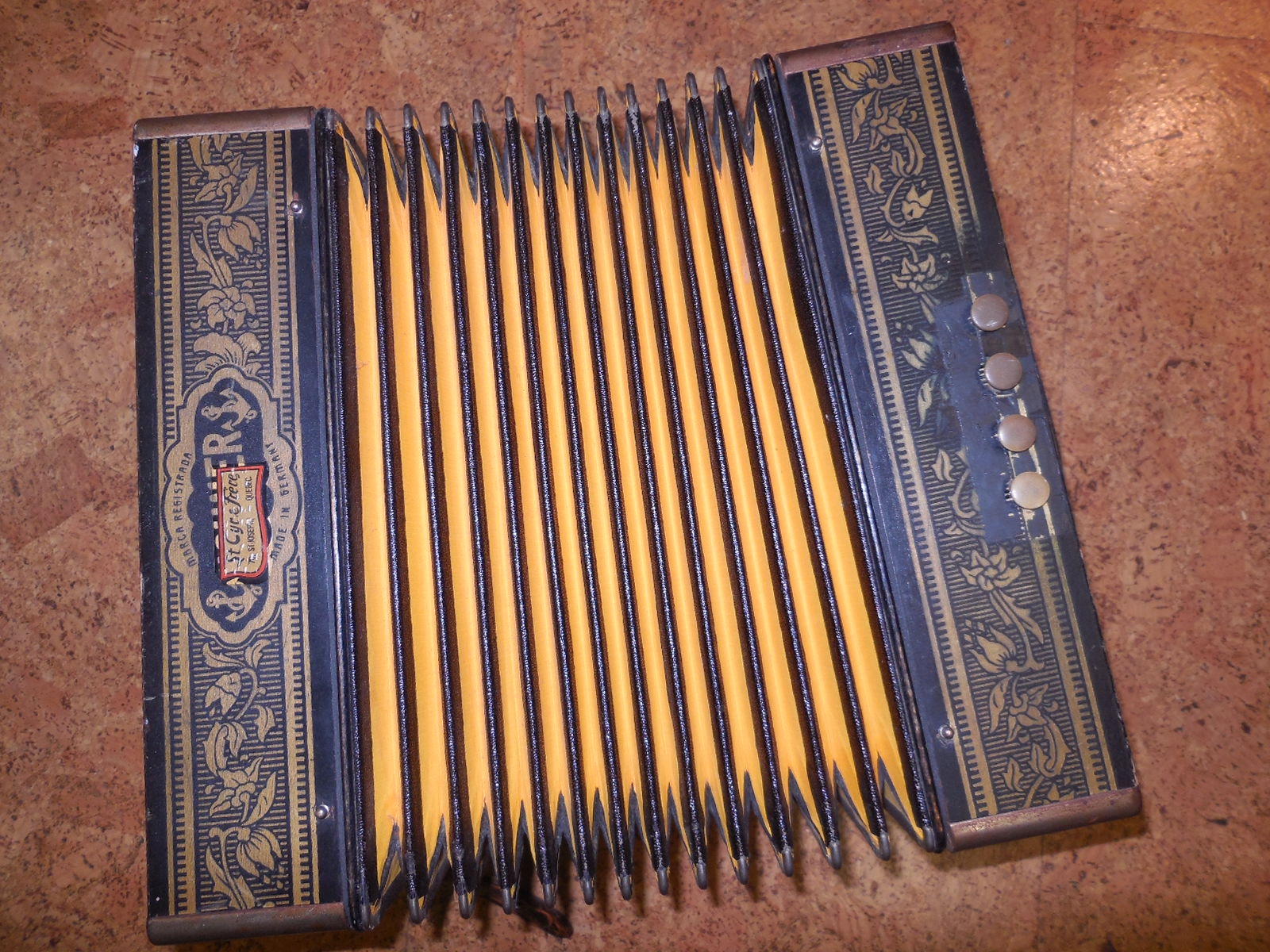 Restored Hohner button accordion in the key of C. This was made in Germany in the Hohner factory. It is in good condition overall. The black and gold painted wood case is in good shape but shows normal wear for an instrument of this age. The original bellows are airtight and have yellow colored papers and black taped edges. It has 10 treble buttons and 4 bass buttons. The treble, chord and bass reeds are steel on individual aluminum plates and have the ‘H’ or ‘T’ marking.