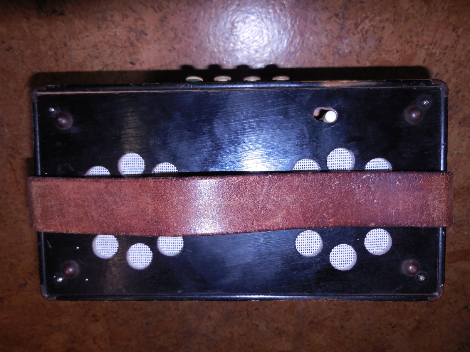 As the photo shows, the metal grill is in nice shape with no dents or missing pieces. The grill cloths have been replaced front and back. The wooden keyboard is intact with no cracks or missing pieces. Often there are cracks or entire sections missing between keys on some of these old accordions. The thumb strap has been removed and the bass and bellows straps are all replacements. I have just added shoulder strap brackets. No strap is included.