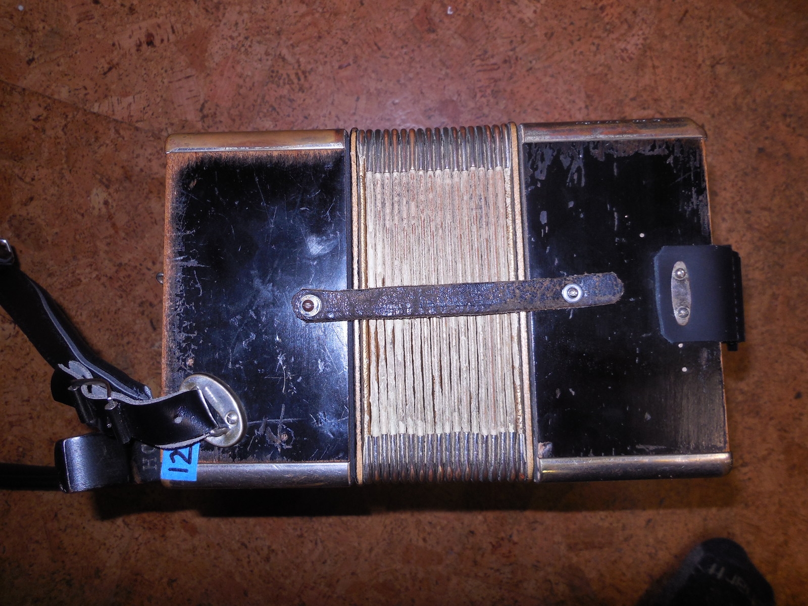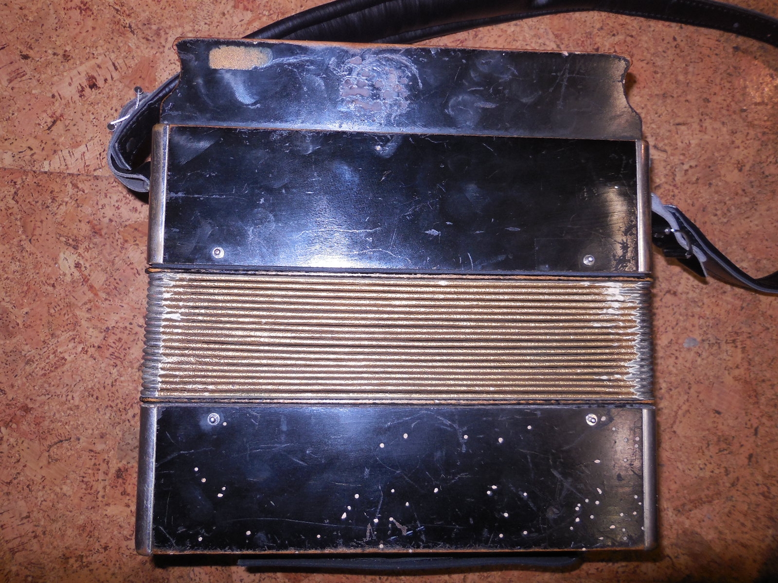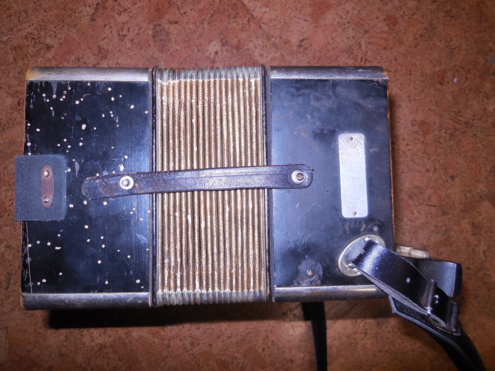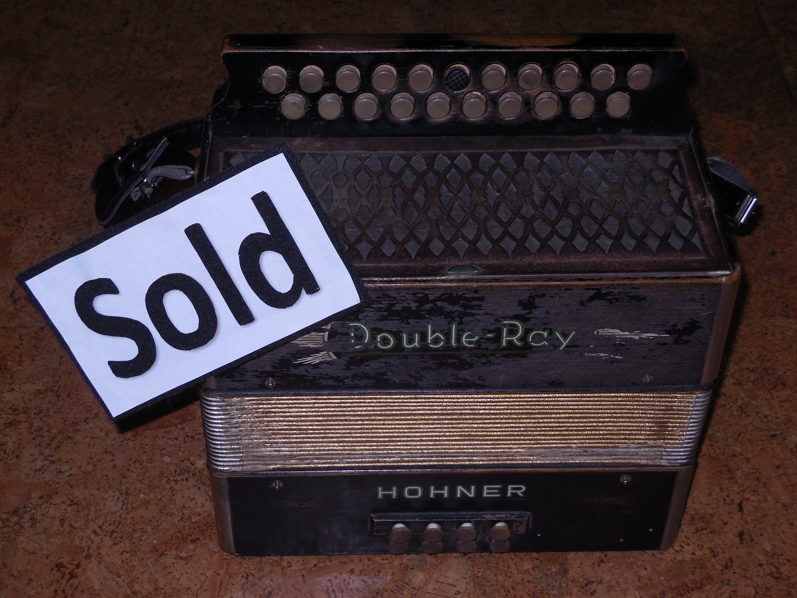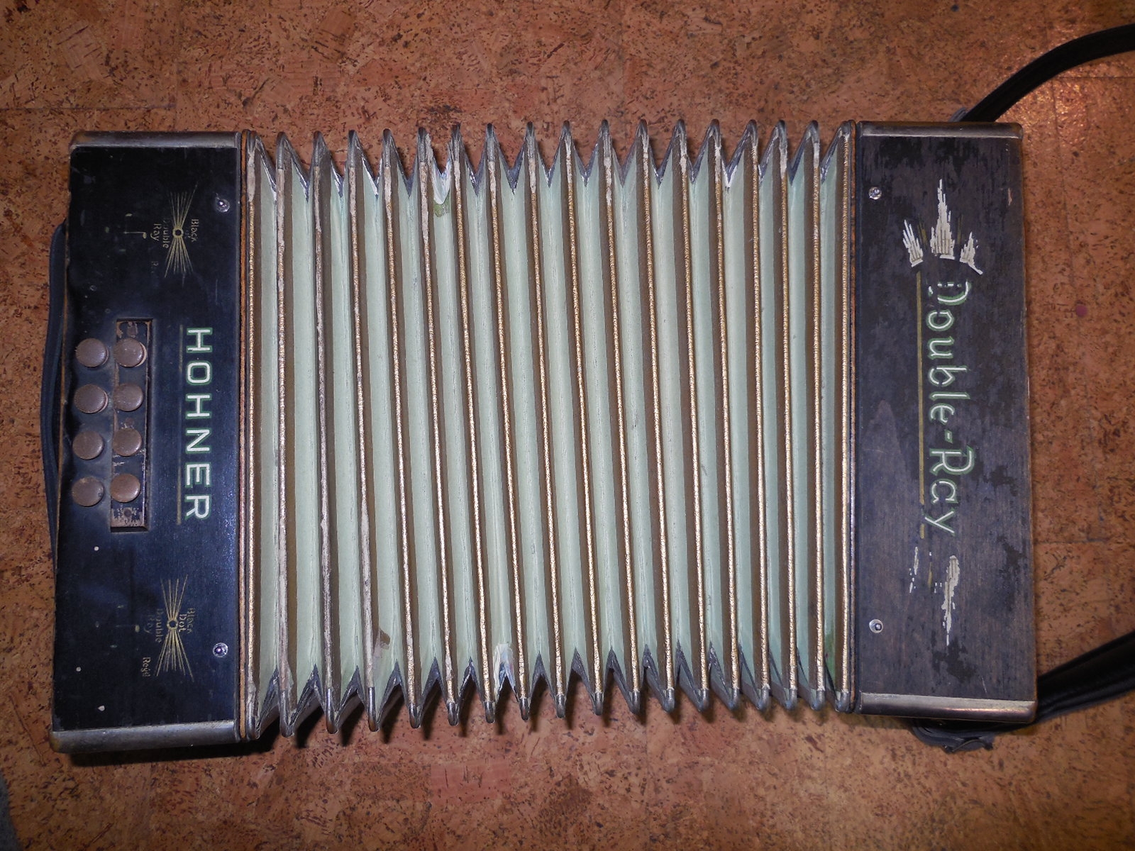 Pre World War 2 Hohner Double Ray Black Dot button accordion in the keys of BC. Original zinc reedplates with steel reeds. It is in fair condition overall. The painted wood case is structurally sound but shows quite a bit of wear. It sounds great and has many improvements including repadded pallets.
