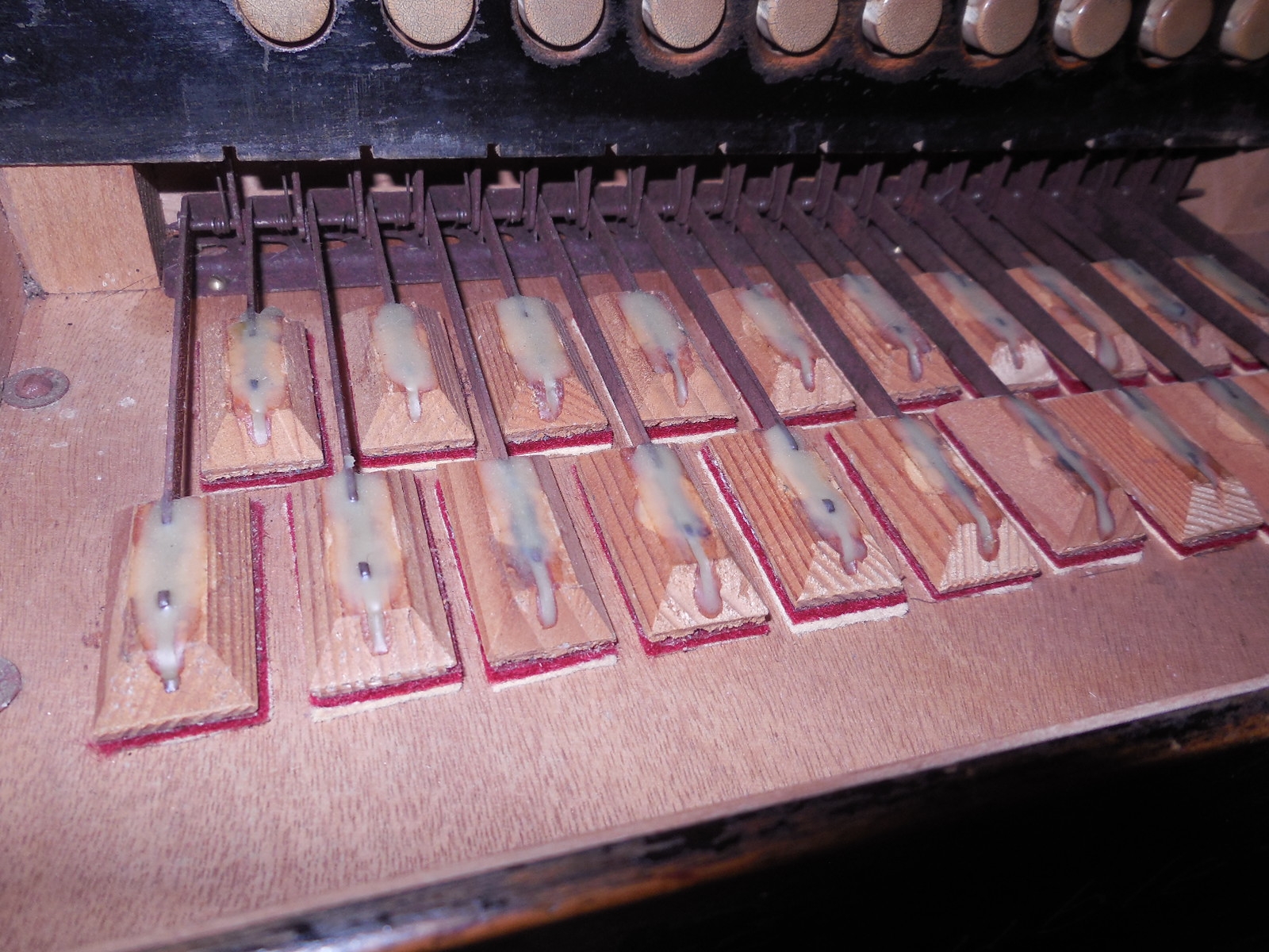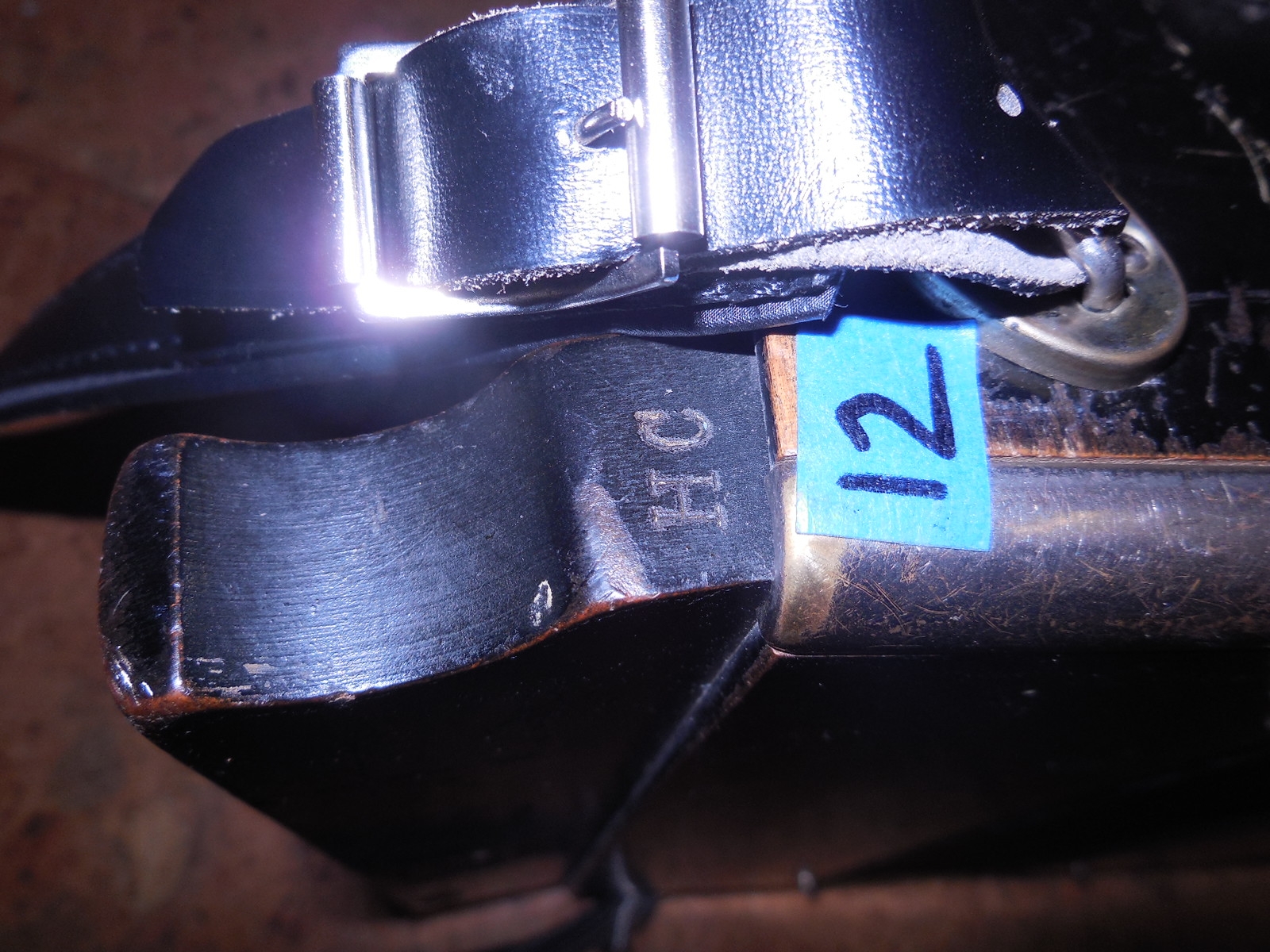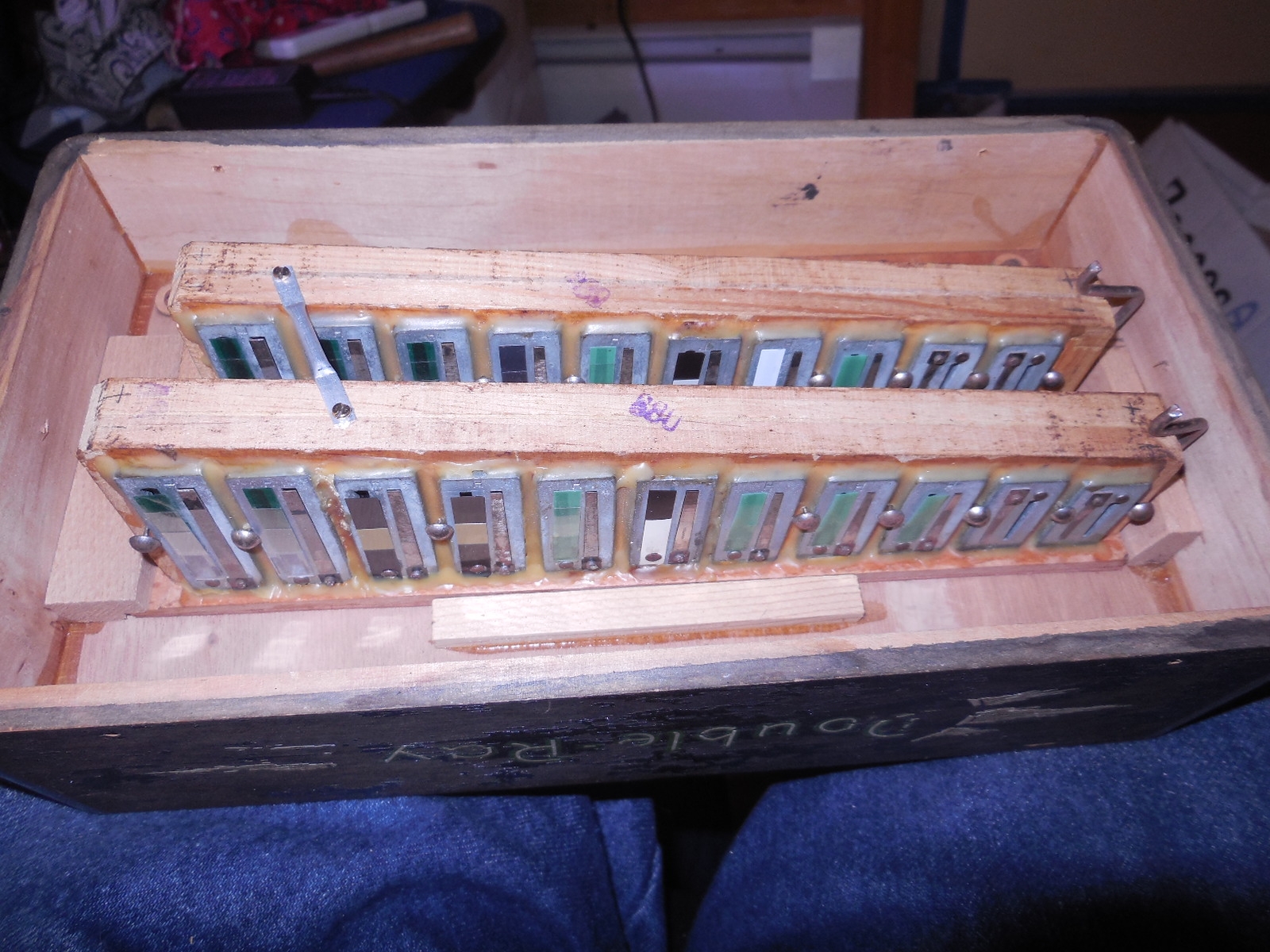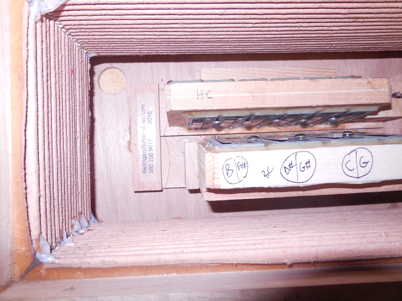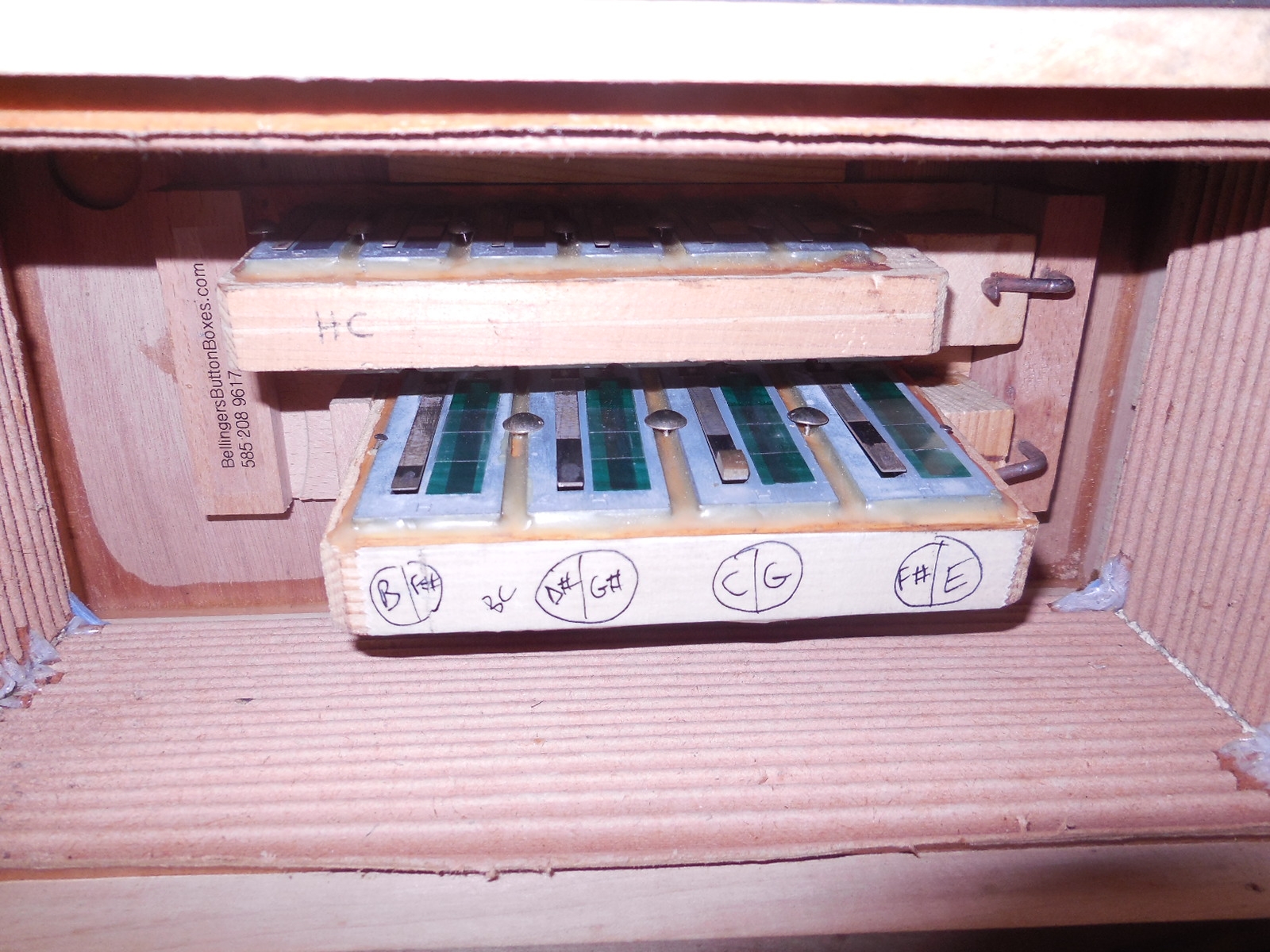 Pre World War 2 Hohner Double Ray Black Dot button accordion in the keys of BC. Original zinc reedplates with steel reeds. It is in fair condition overall. The painted wood case is structurally sound but shows quite a bit of wear. It sounds great and has many improvements including repadded pallets.