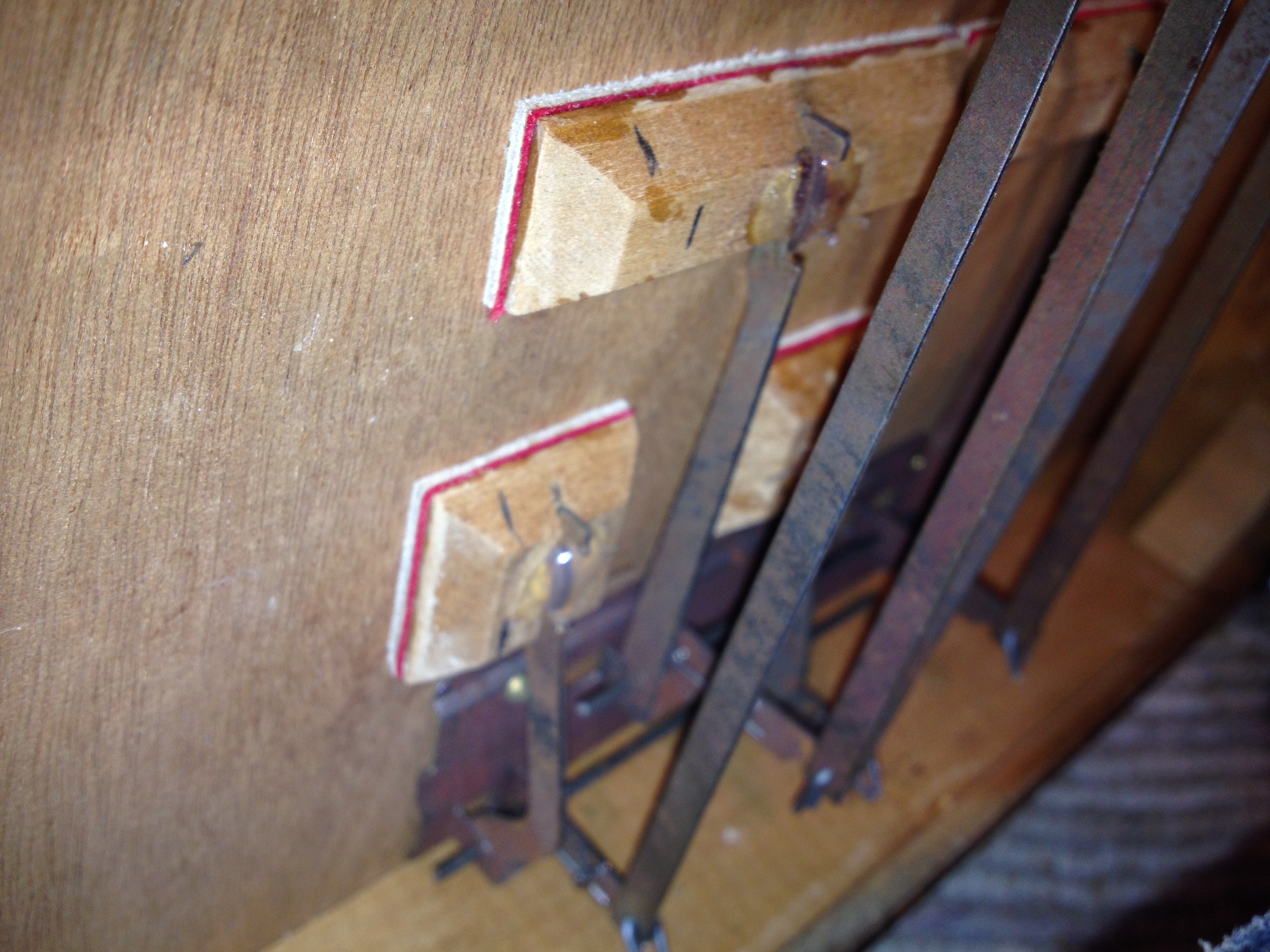 This has had the pallet pads replaced with new felt cushioned pads both sides. The button travel on the treble side has been limited so the buttons don’t ‘disappear’ down into the holes. The buttons stop when they are about flush with the top of the keyboard.