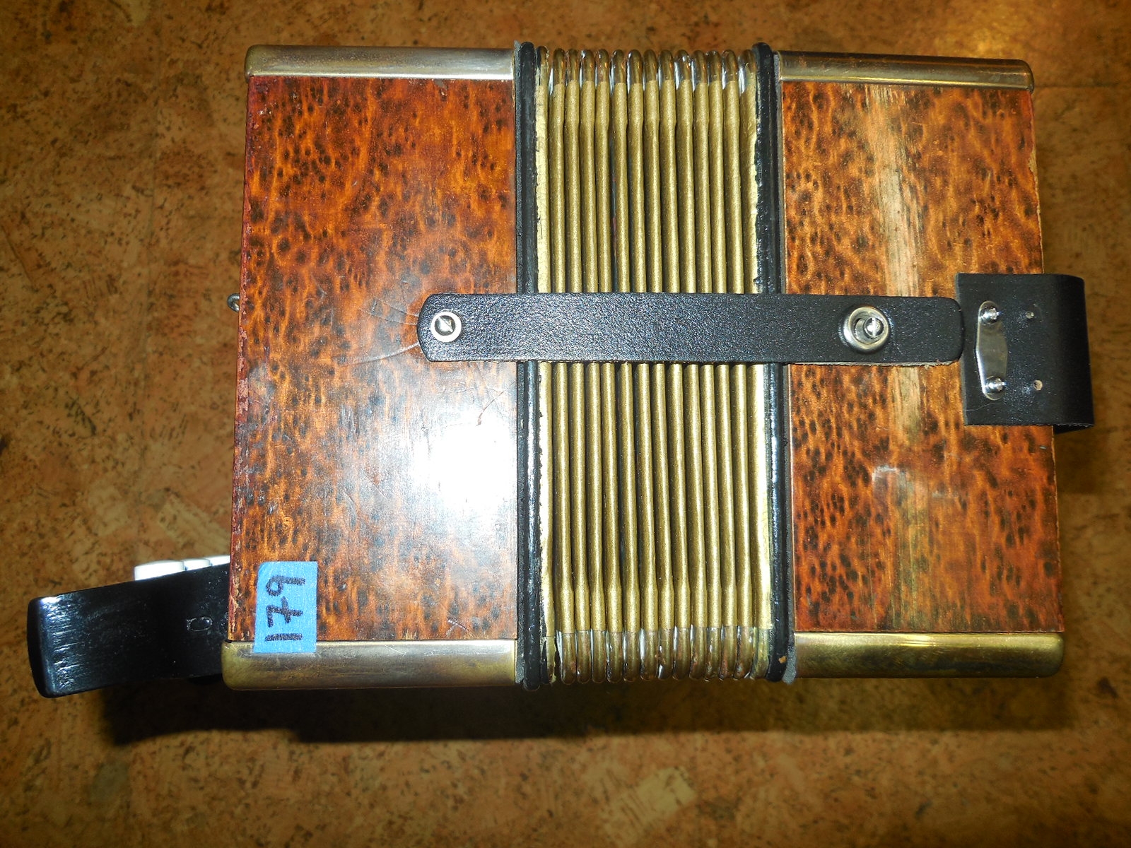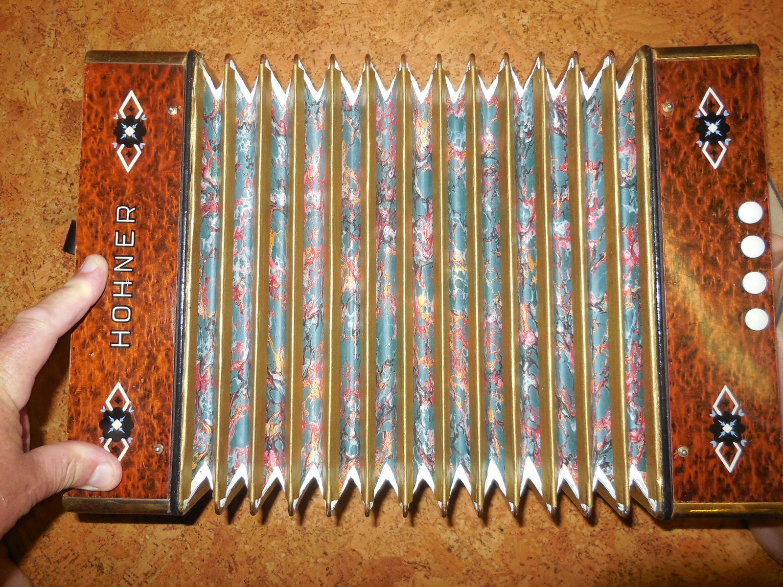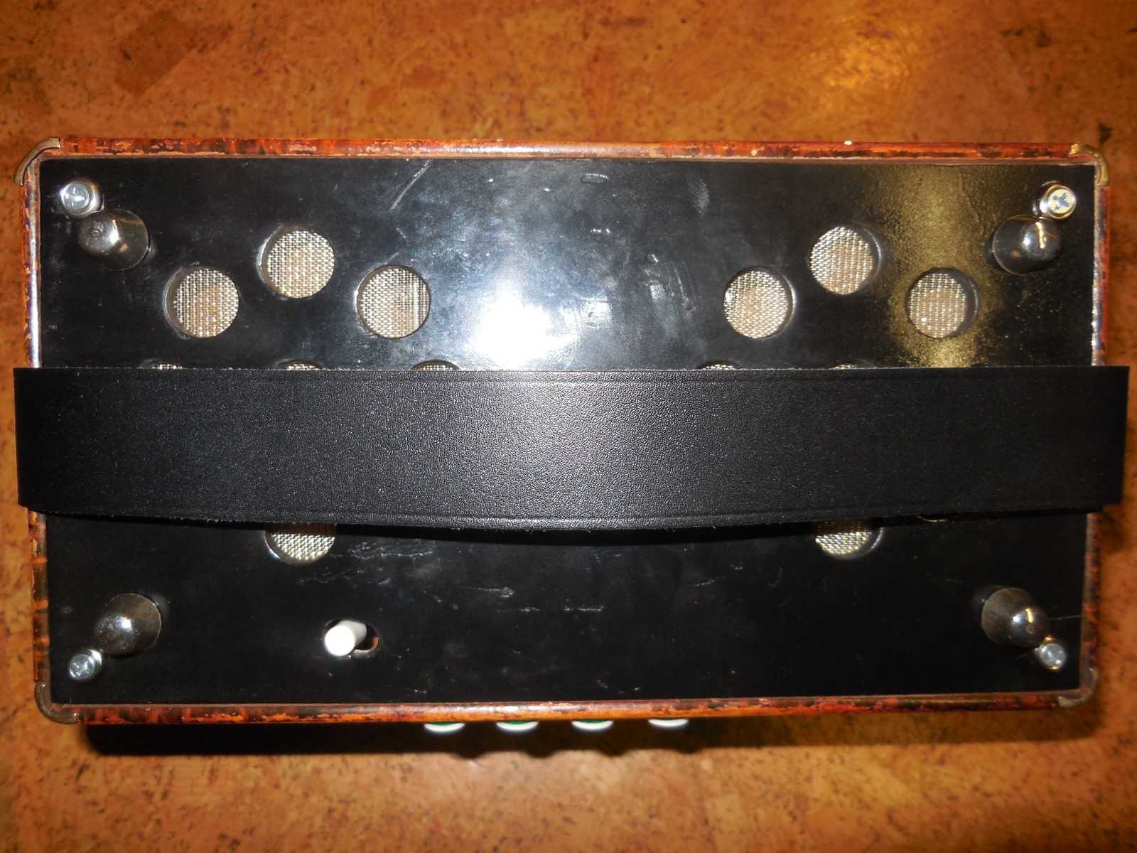Most of these older Hohner accordions are found with numerous notes out of tune, wheezing or not sounding at all. This was just fully tuned. There are 56 reeds in this instrument and every single one has been tuned. The treble reeds were tuned with a tremolo beat frequency of approximately 1.5 Hz at the low notes gradually rising to about 5 Hz at the high notes, for a sweet tremolo. Since this is a one row instrument I have tuned the thirds flatter than equal temperament, closer to just temperament for a sweeter sound. This technique doesn’t work well on multi-row instruments as any particular note could be used in different keys so equal works better in that case.