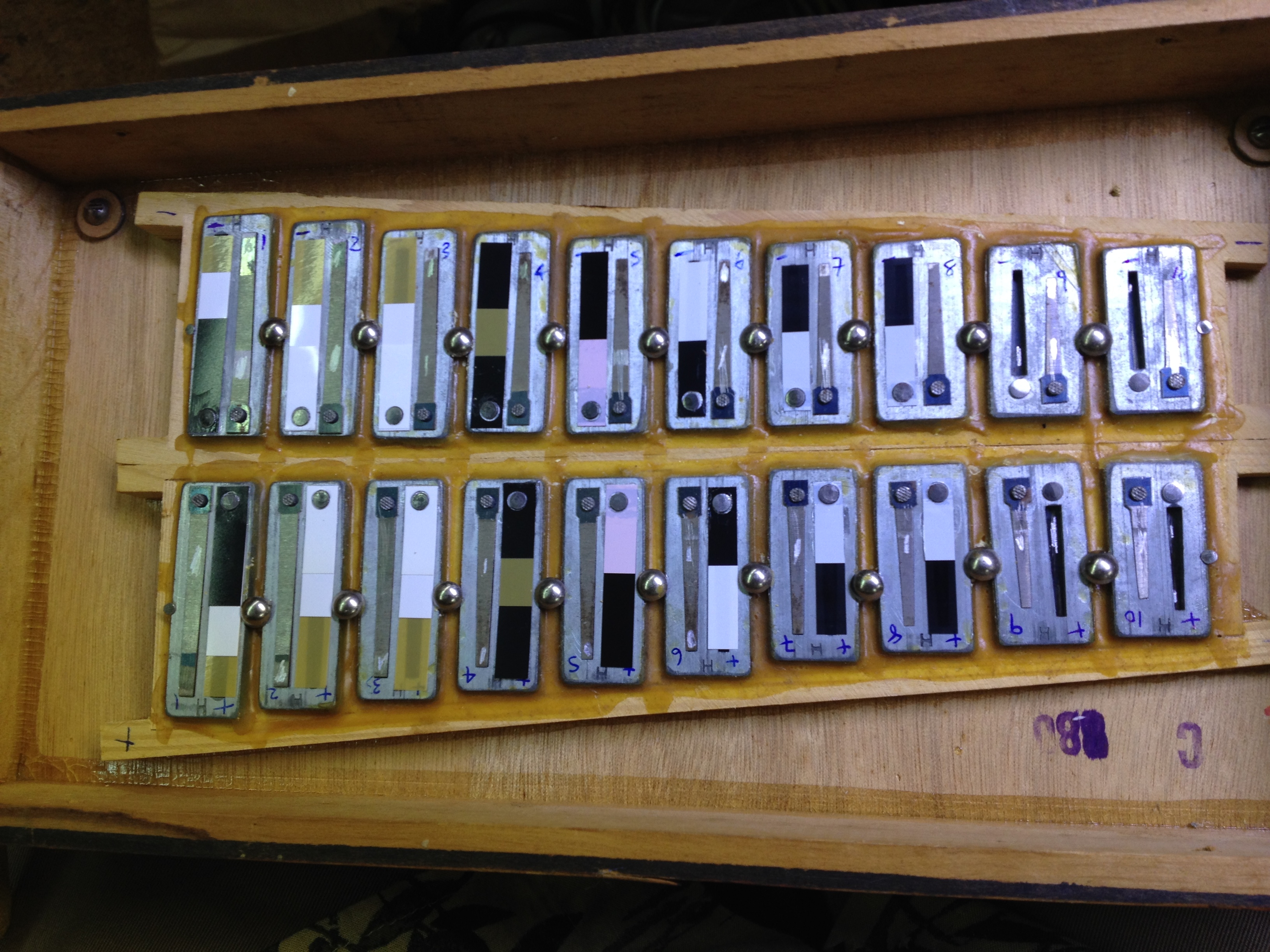 The original leather one way valves on the large bass reedplates and some of the treble reedplates were all removed and replaced with modern plastic one way valves for long trouble free life. The chord reed leathers and some of the treble are working fine and were left alone. Final tuning occurs in situ with the reedblocks attached to the case. New bellows gaskets were also fitted.