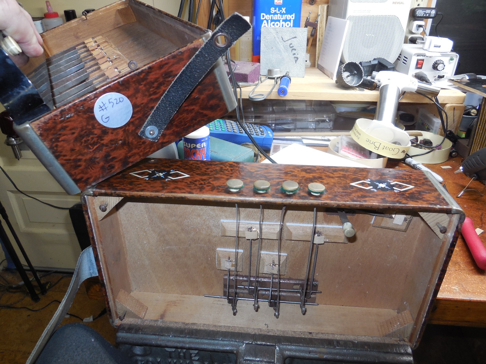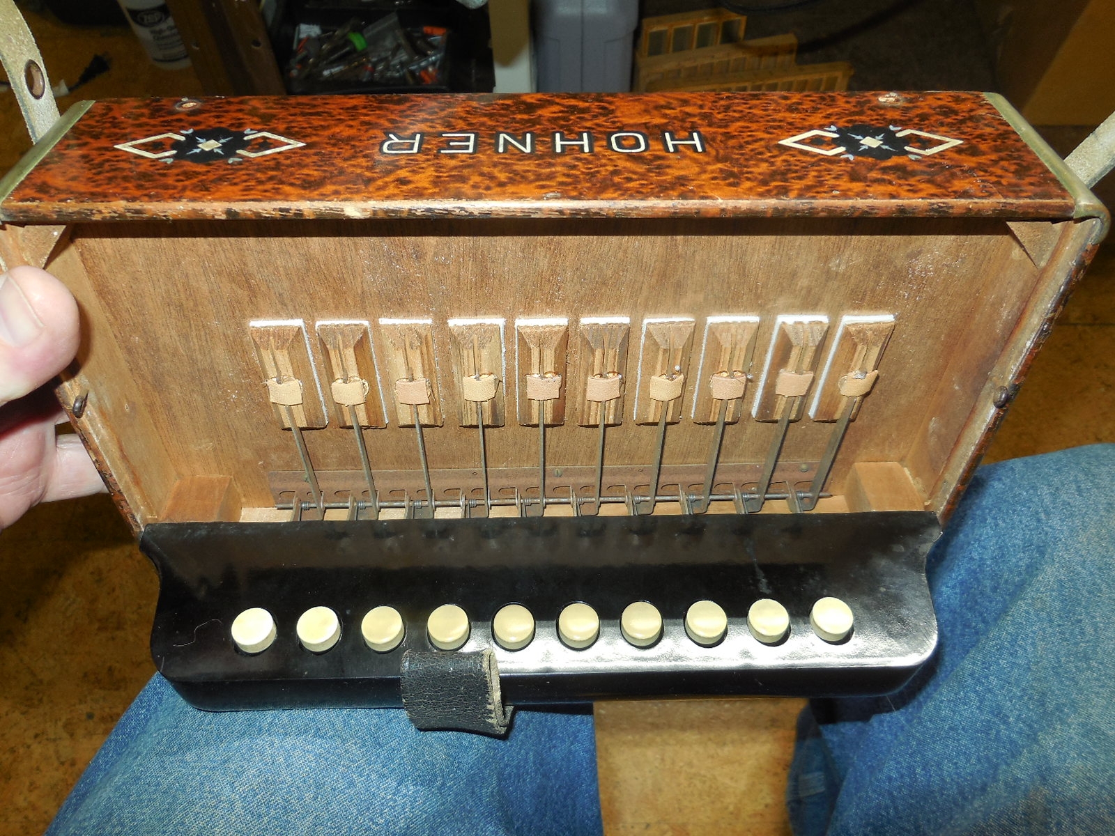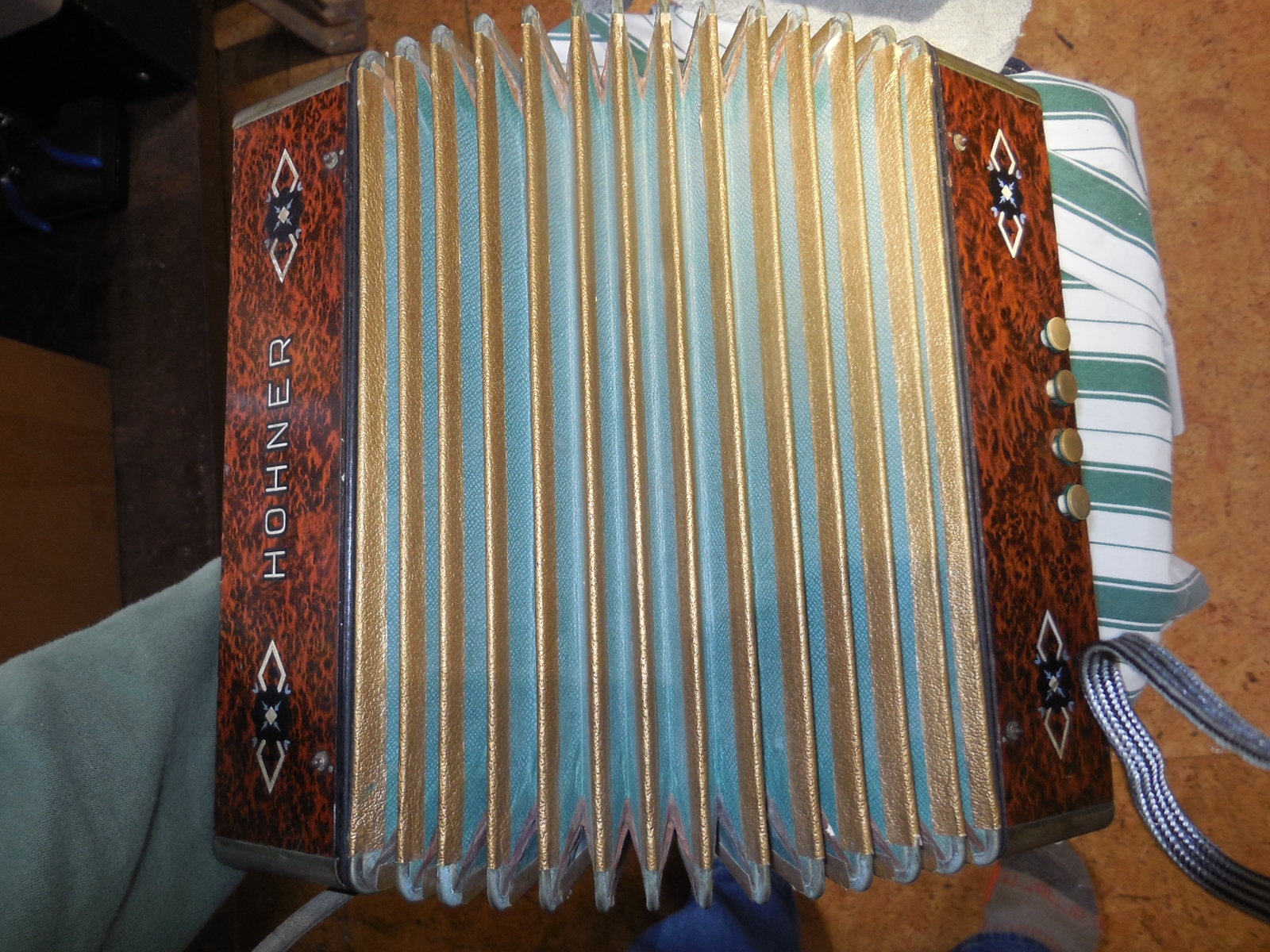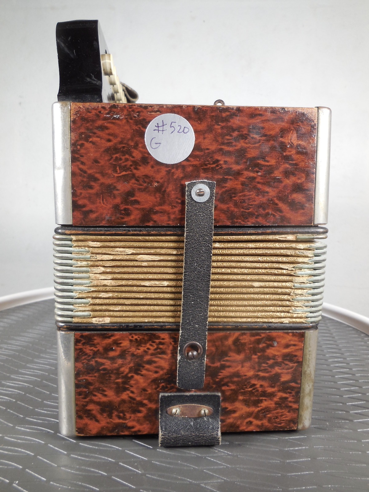Most of these older Hohner accordions are found with numerous notes out of tune, wheezing or not sounding at all. This was just fully tuned. There are 60 reeds in this instrument and every single one has been tuned. The treble reeds were tuned with a tremolo beat frequency of approximately 2 Hz at the low notes gradually rising to about 6 Hz at the high notes, for a sweet tremolo. Since this is a one row instrument I have tuned the thirds flatter than equal temperament, closer to just temperament for a sweeter sound. This technique doesn’t work well on multi-row instruments as any particular note could be used in different keys so equal works better in that case.