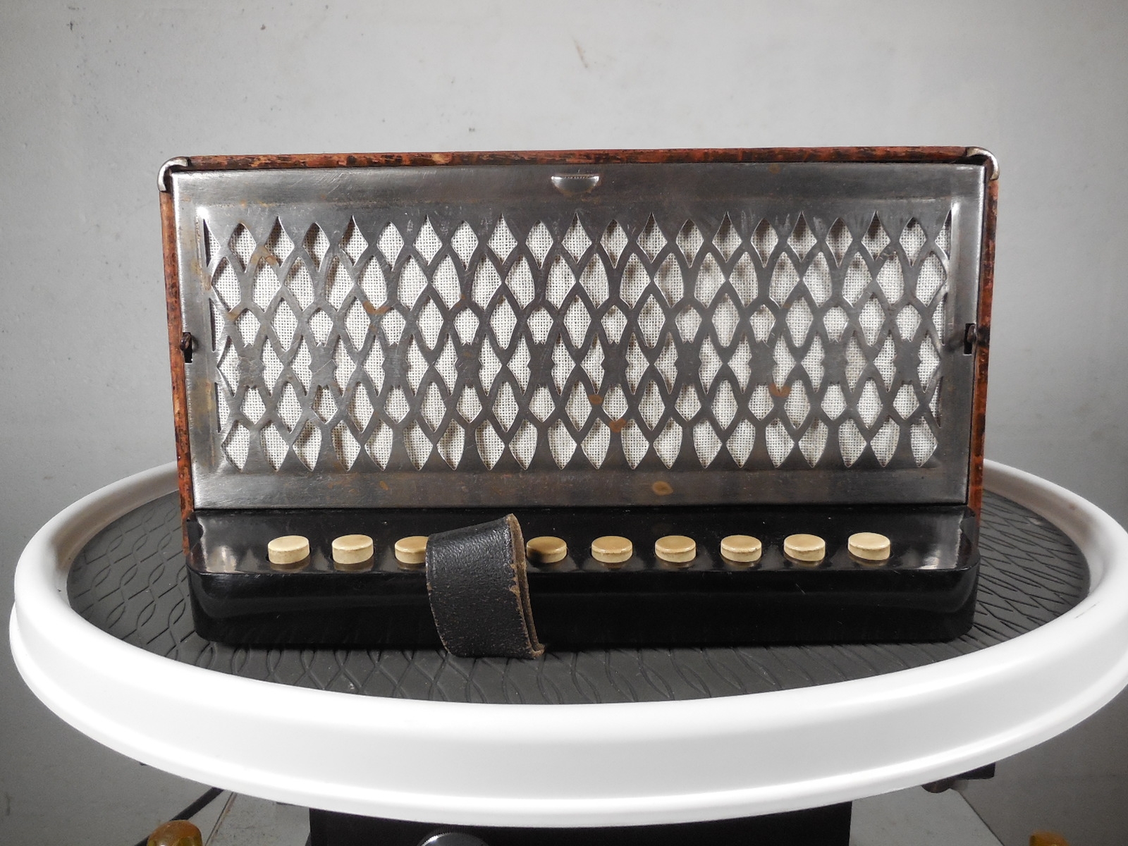 As the photo shows, the metal grill is in nice shape with no dents or missing pieces. The grill cloths were replaced front and back. The plastic keyboard is intact with no cracks or missing pieces. The thumb, bass and bellows straps are all original and functioning fine.