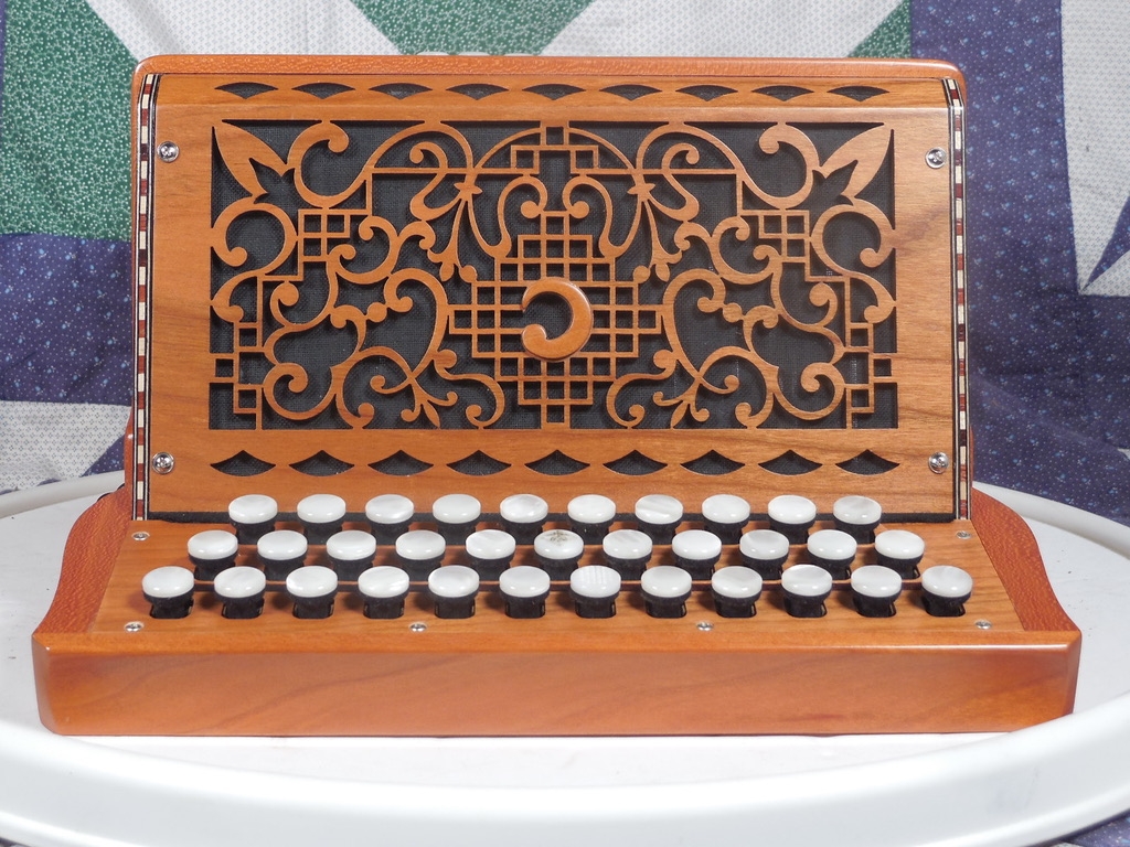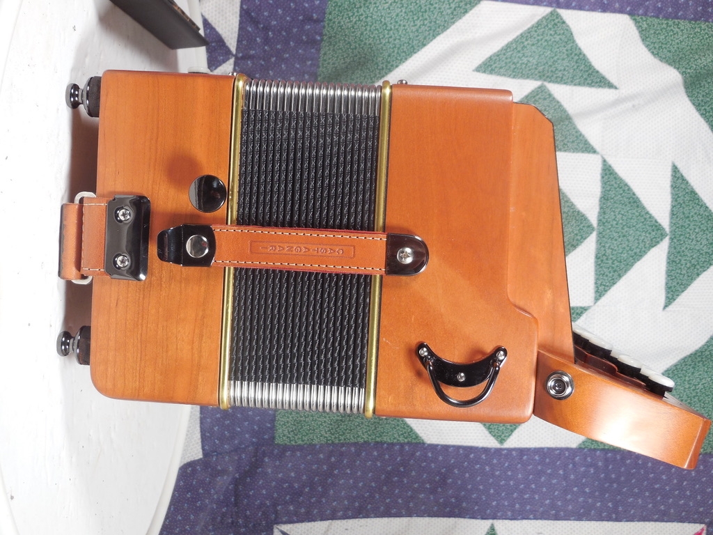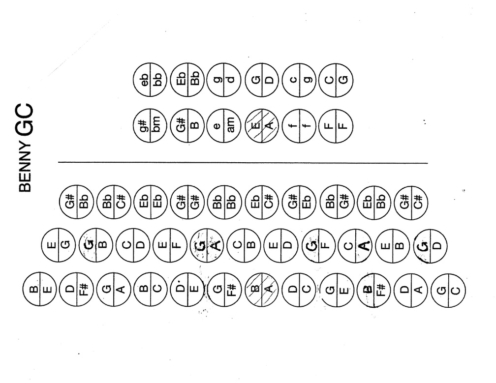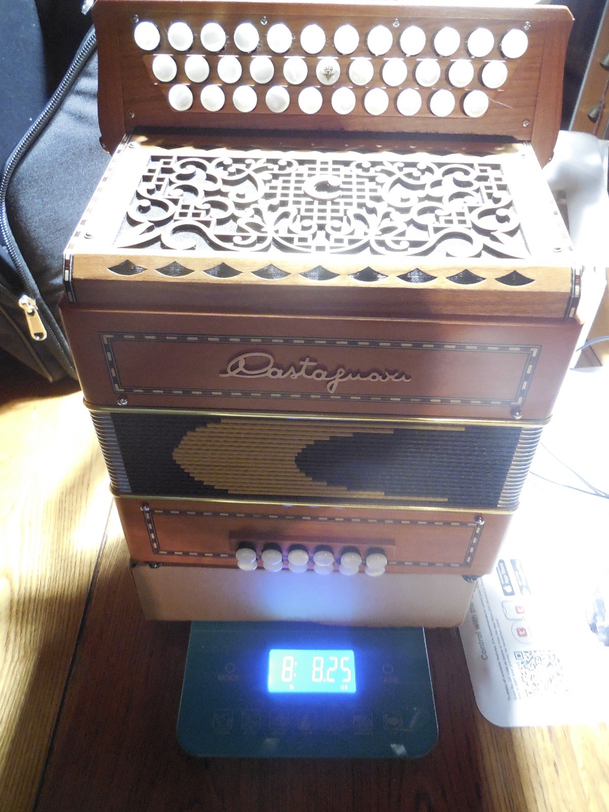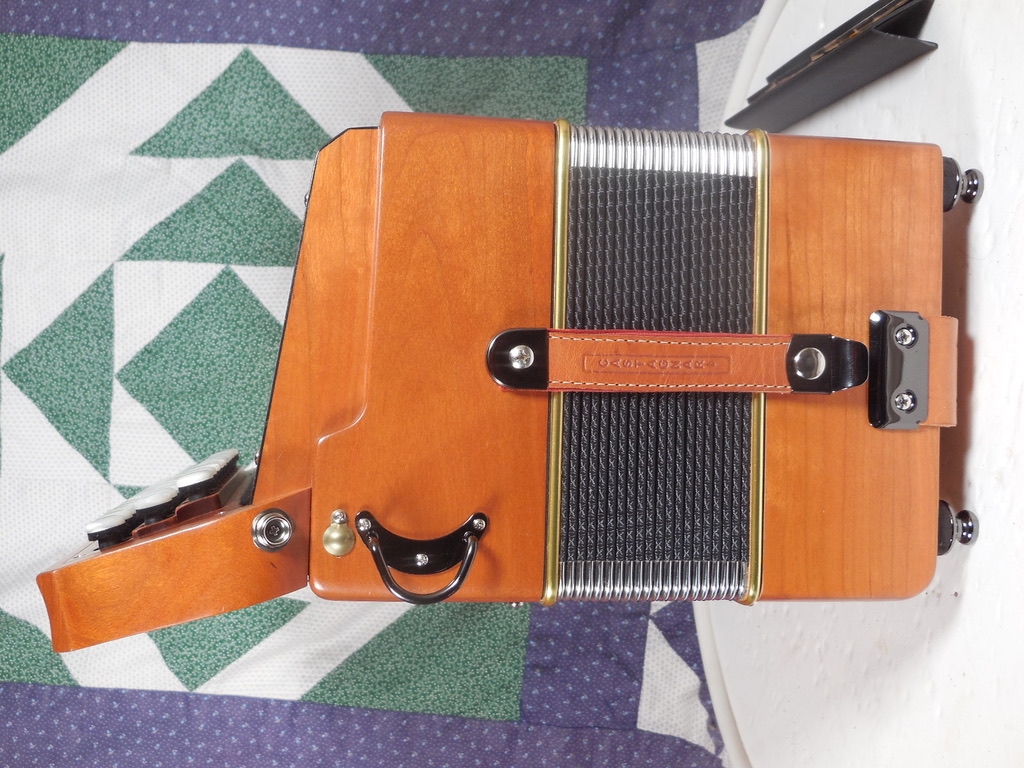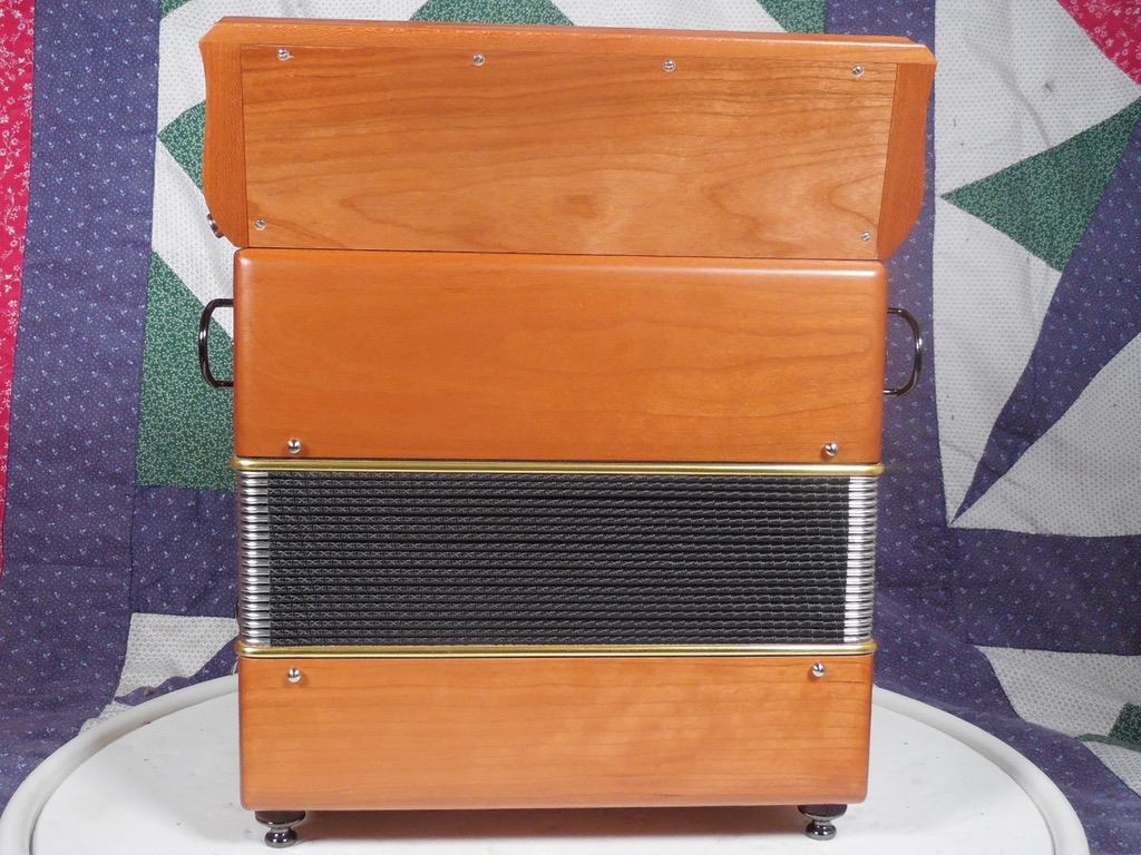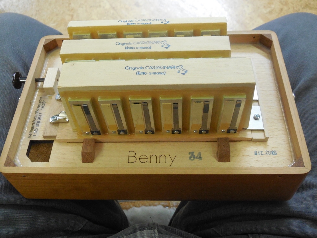 The Benny has 2 voices in MM configuration. There is one stop on the bass side that controls the thirds of the chords. It features Voci Armaniche tipo-a-mano reeds. I have just tuned the instrument now. The MM reeds were tuned to give about 01.4 Hz tremolo low notes to 6 Hz high notes.