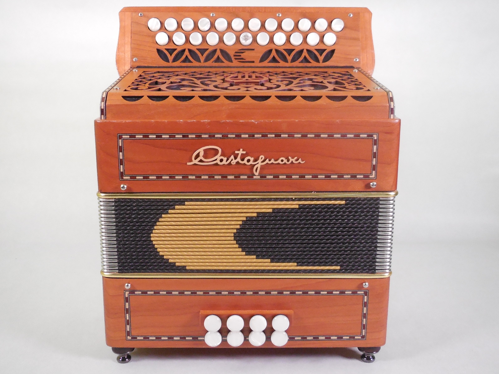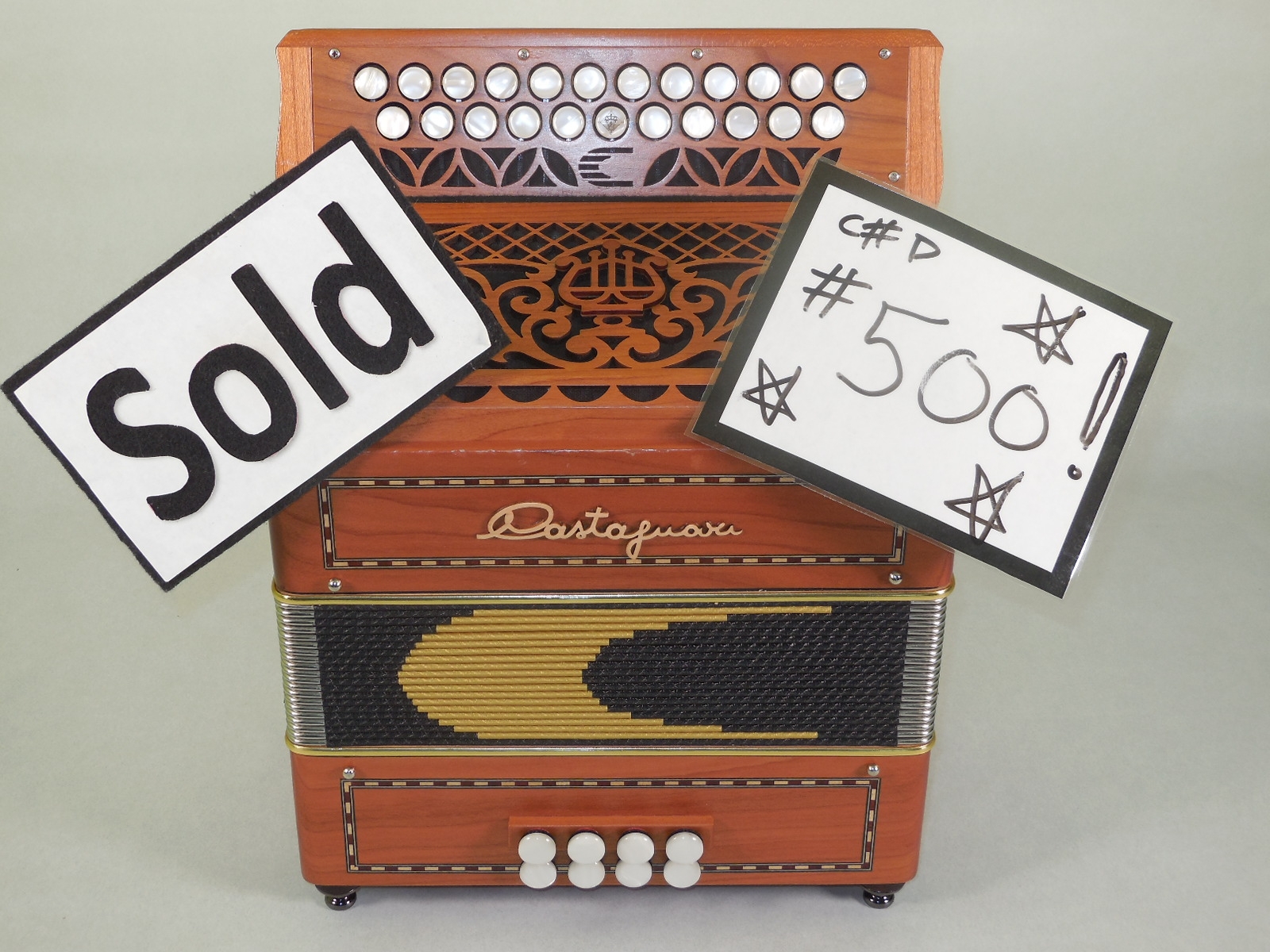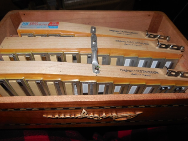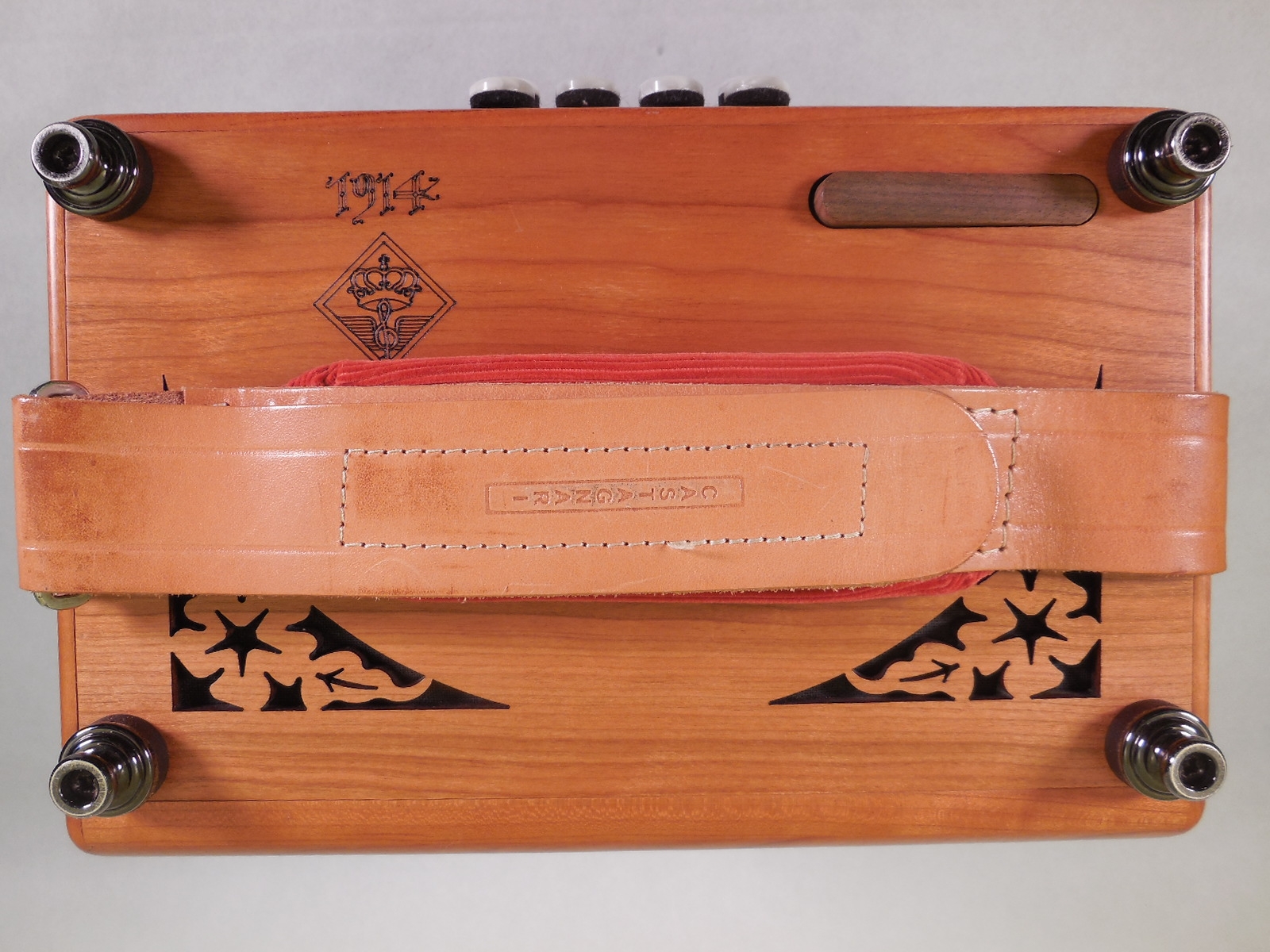 Very nice condition cherry wood Castagnari Dinn III in C#D for sale. Comes with original Castagnari hardshell case and one shoulder strap. Just tuned. This is a compact 3 voice LMM instrument with a stop for the low reeds. This instrument was made in Italy in 2016.