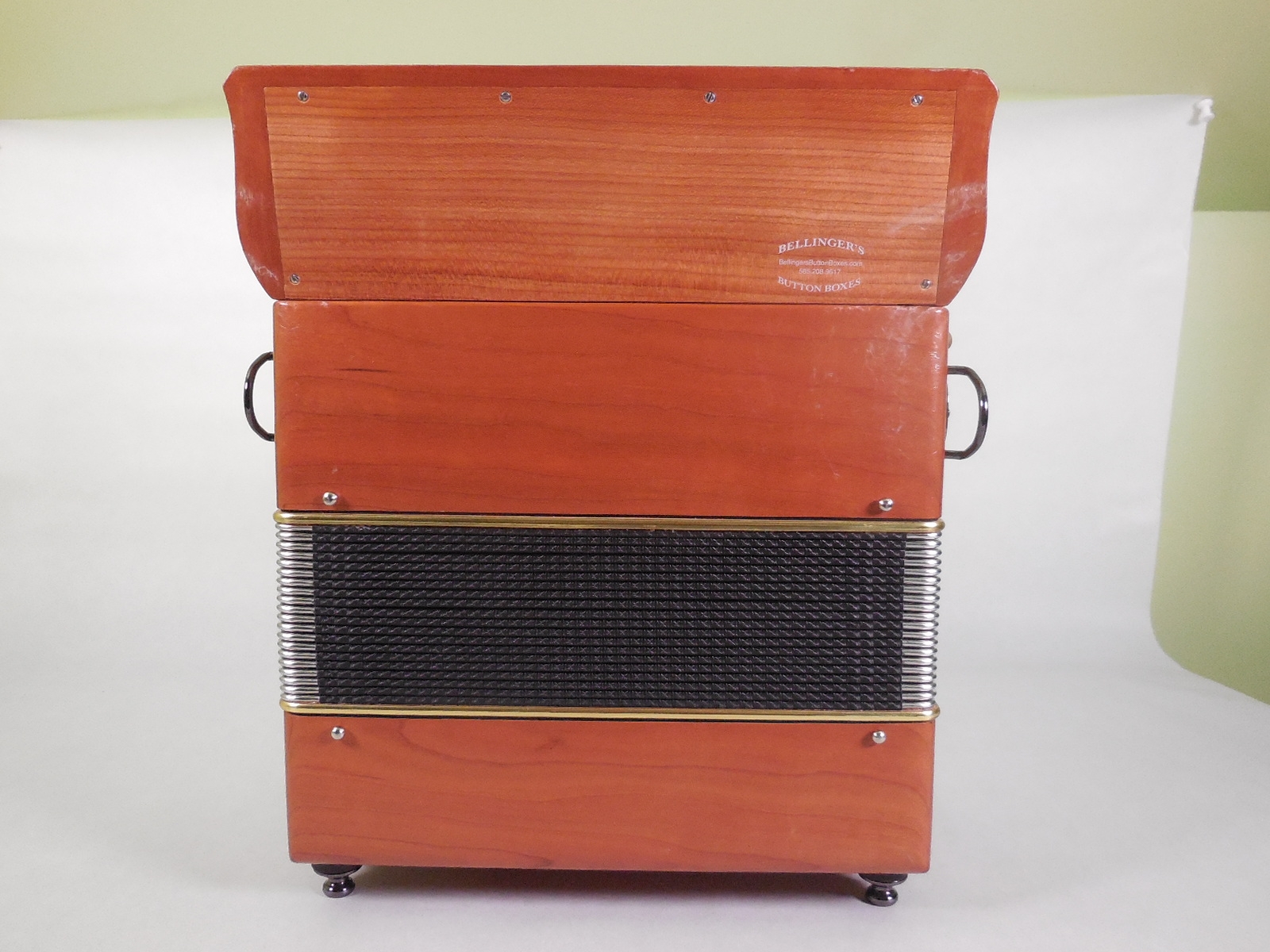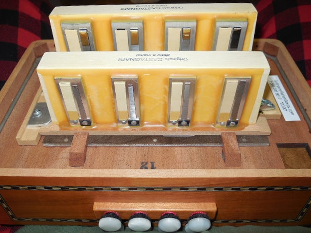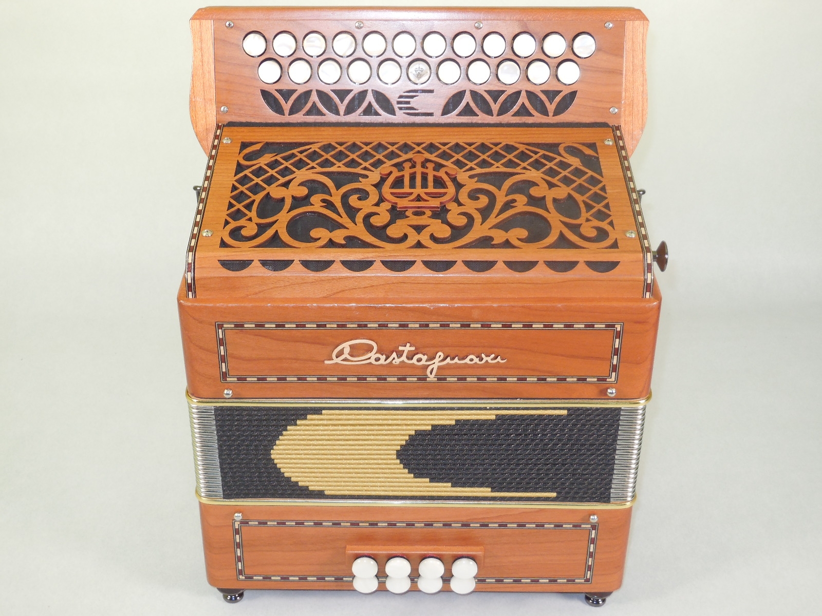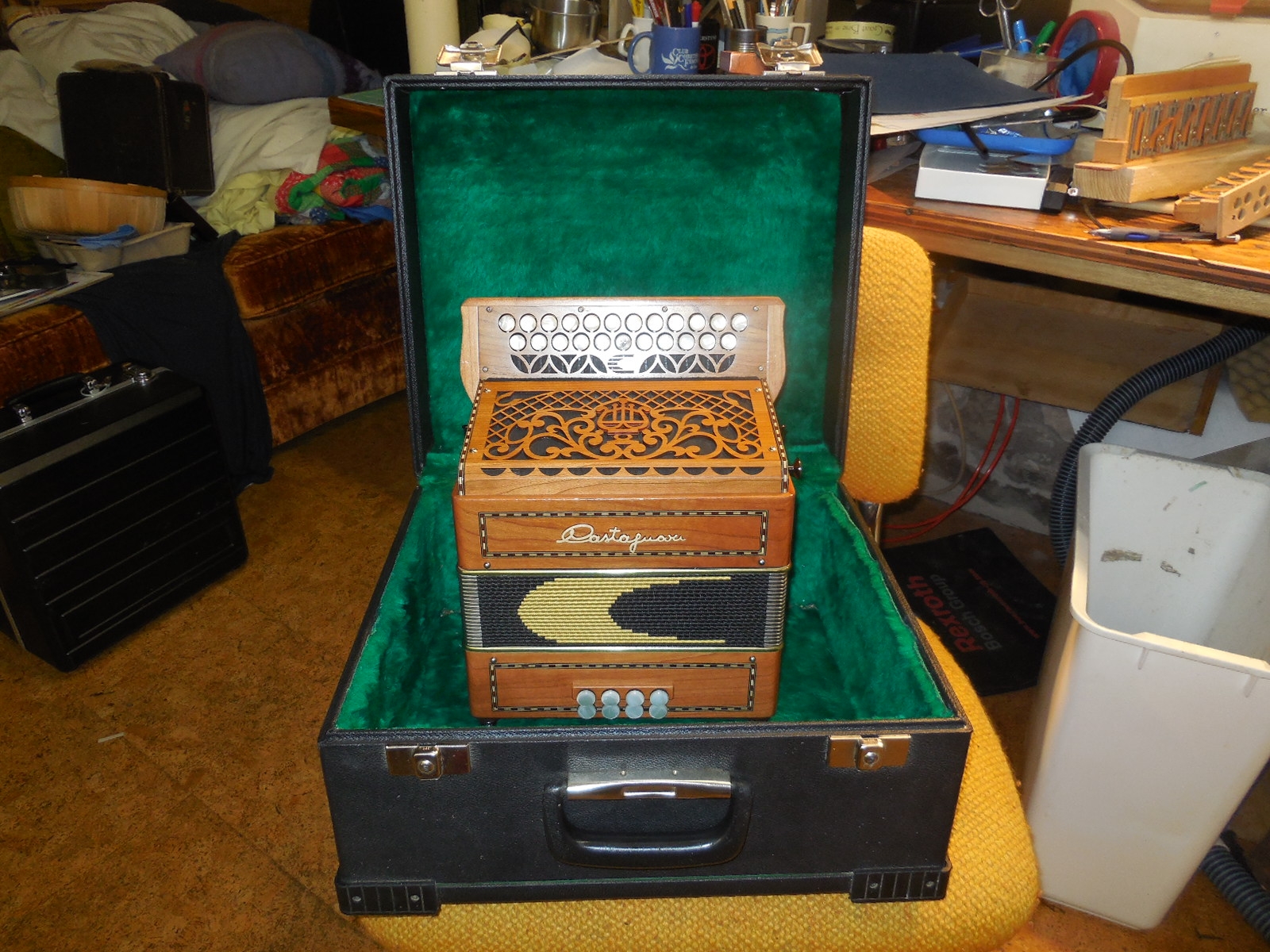 Very nice condition cherry wood Castagnari Dinn III in C#D for sale. Comes with original Castagnari hardshell case and one shoulder strap. Just tuned. This is a compact 3 voice LMM instrument with a stop for the low reeds. This instrument was made in Italy in 2016.