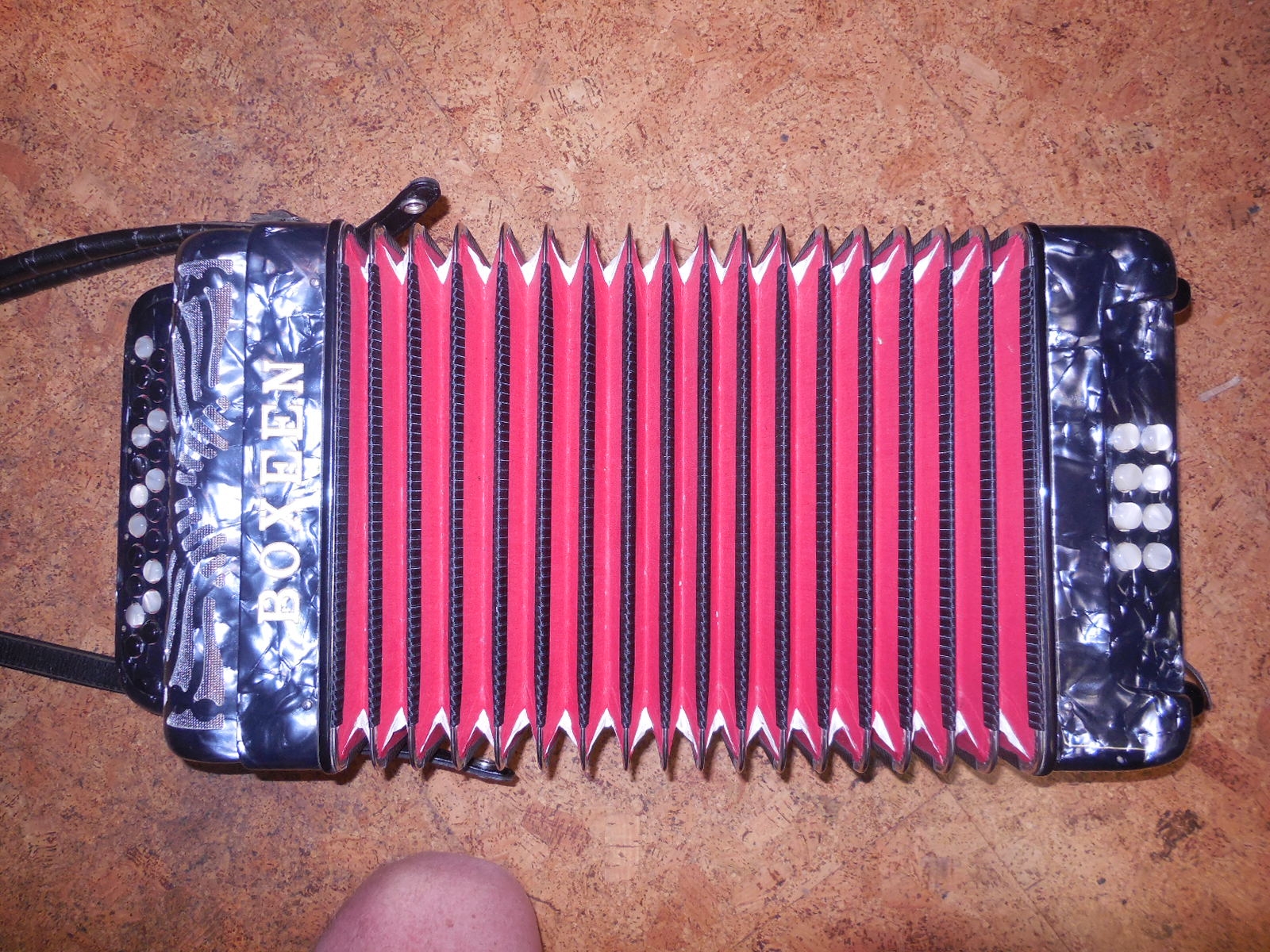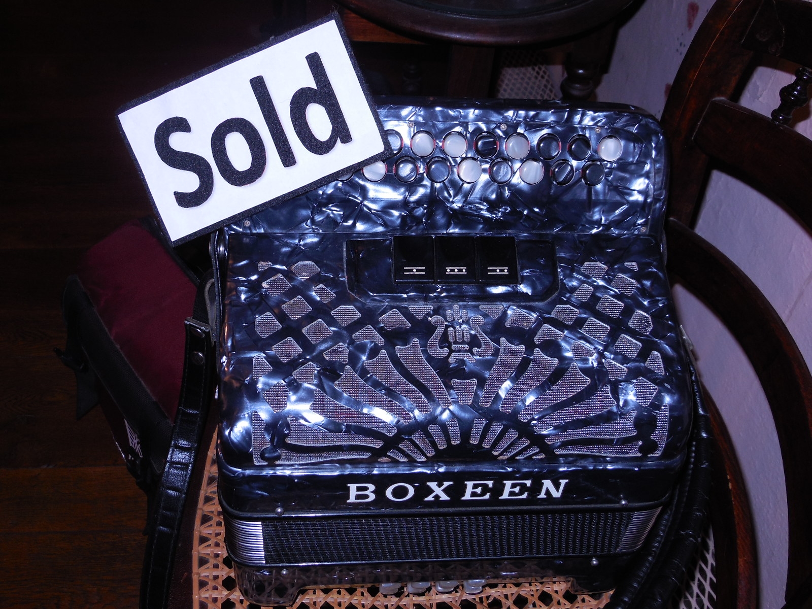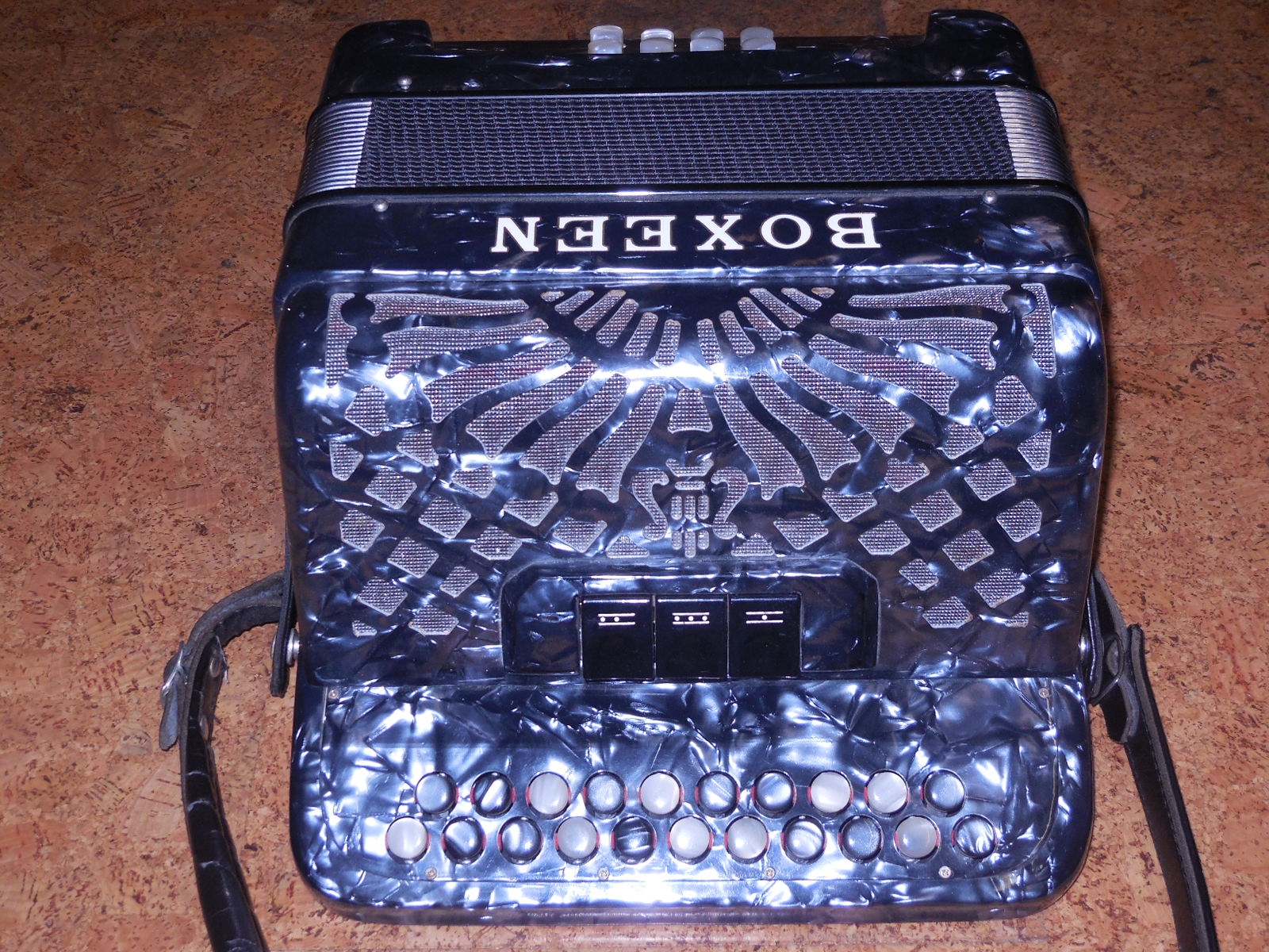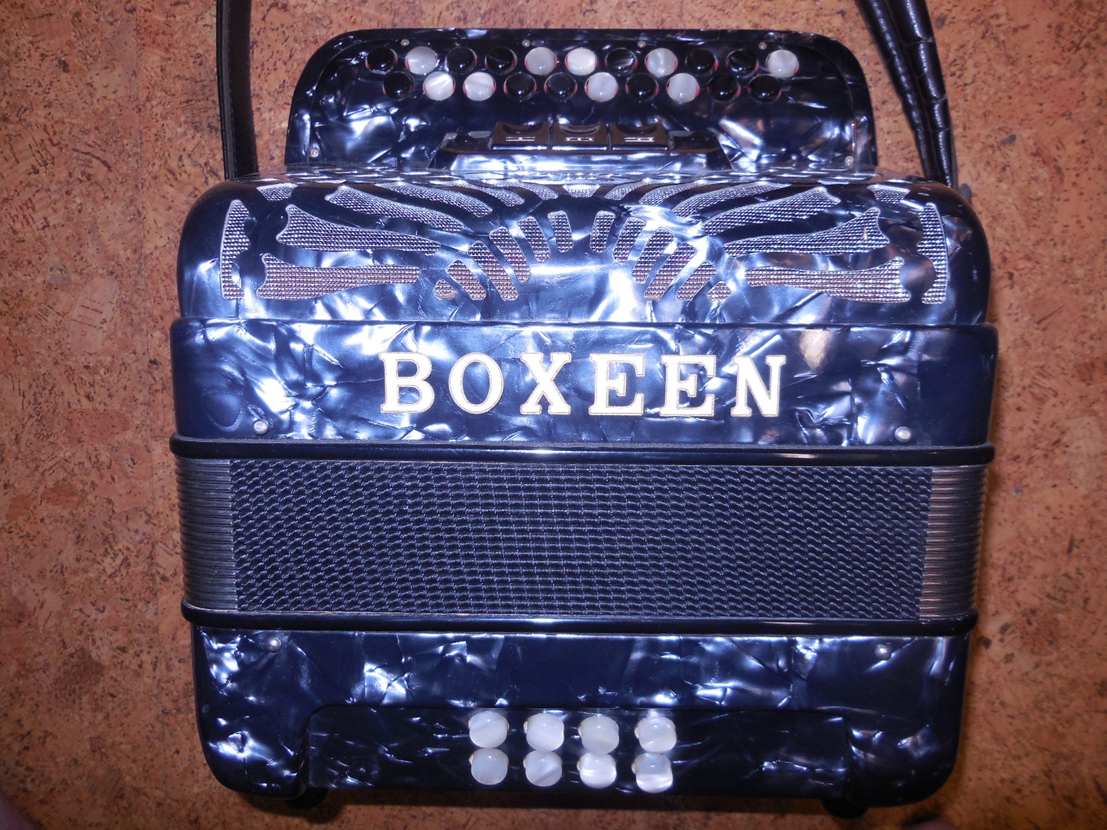 Excellent condition Boxeen button accordion in C#D for sale. This is a normal size 3 voice MMM instrument with 3 registers on the grill providing M, MM and MMM settings. This looks almost new. The mechanical parts are in excellent condition. Please see photos. The bellows are worked in nicely and supple in use but don’t show any wear on the tape. The treble reeds are made by Antonelli.