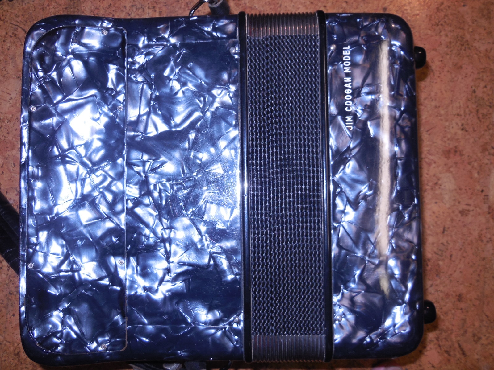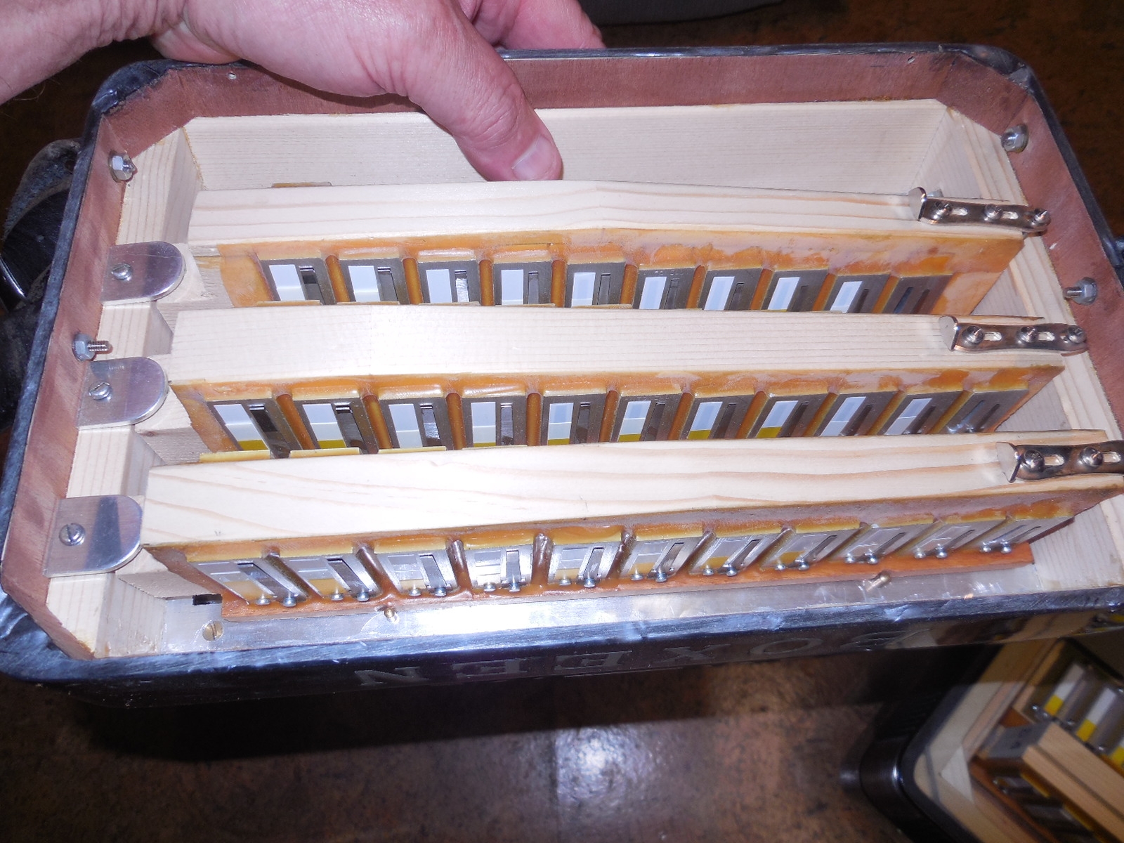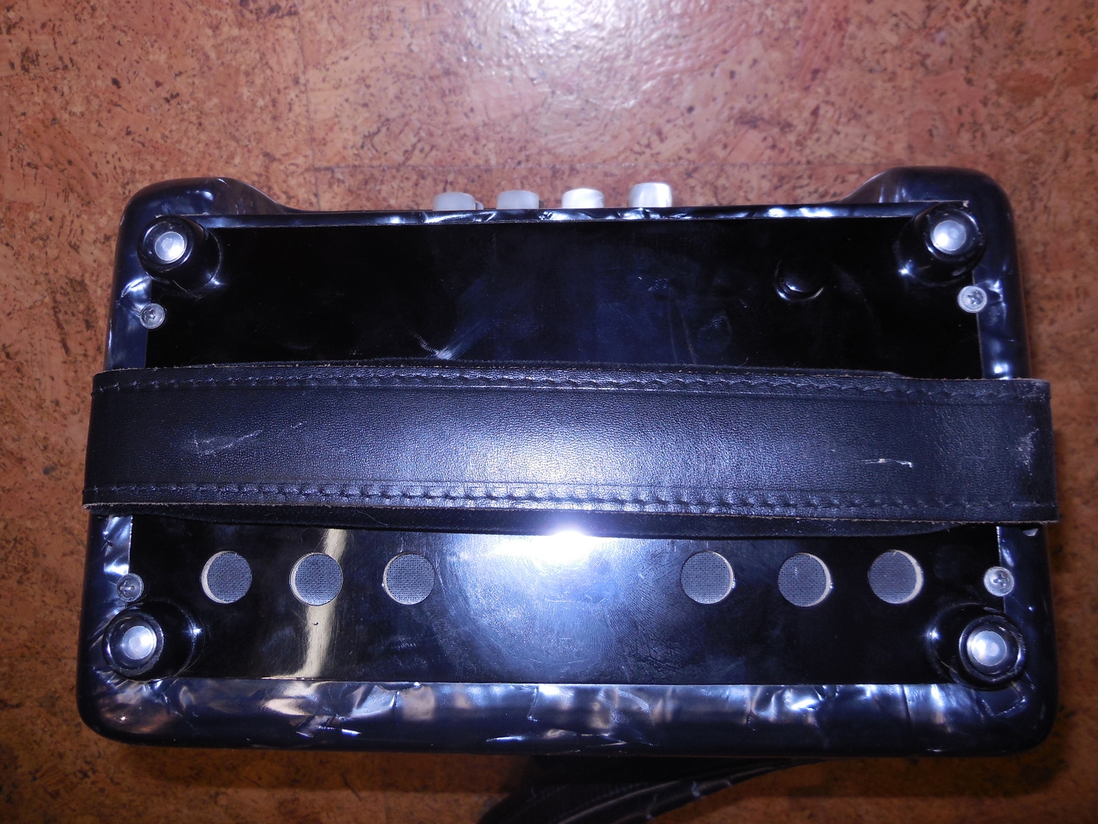 Excellent condition Boxeen button accordion in C#D for sale. This is a normal size 3 voice MMM instrument with 3 registers on the grill providing M, MM and MMM settings. This looks almost new. The mechanical parts are in excellent condition. Please see photos. The bellows are worked in nicely and supple in use but don’t show any wear on the tape. The treble reeds are made by Antonelli.
