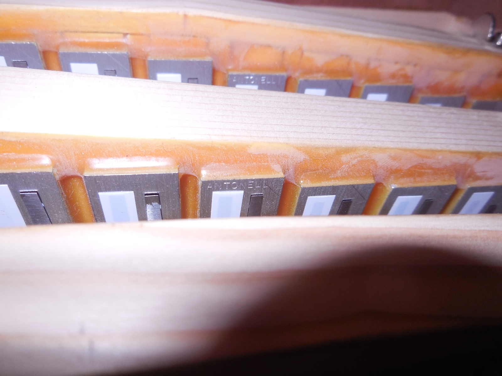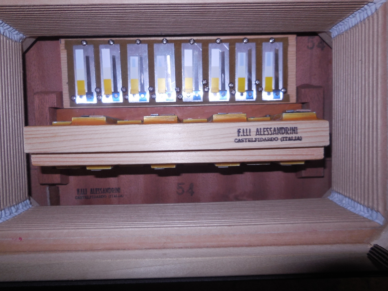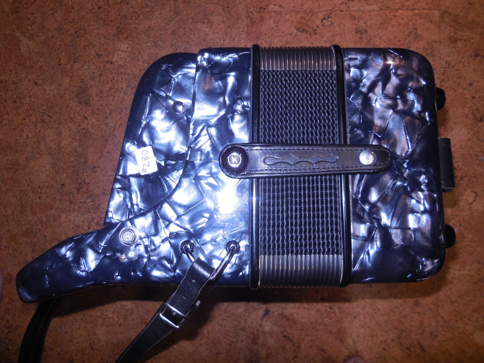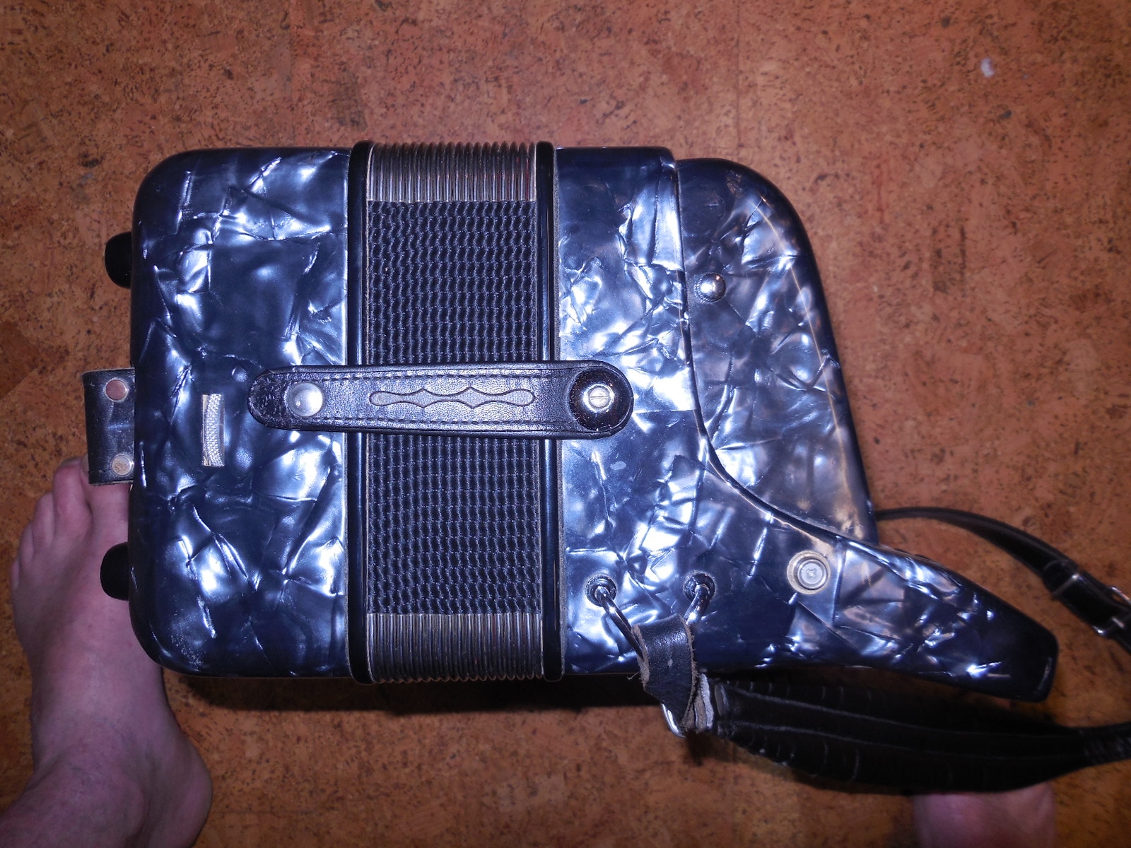 Excellent condition Boxeen button accordion in C#D for sale. This is a normal size 3 voice MMM instrument with 3 registers on the grill providing M, MM and MMM settings. This looks almost new. The mechanical parts are in excellent condition. Please see photos. The bellows are worked in nicely and supple in use but don’t show any wear on the tape. The treble reeds are made by Antonelli.