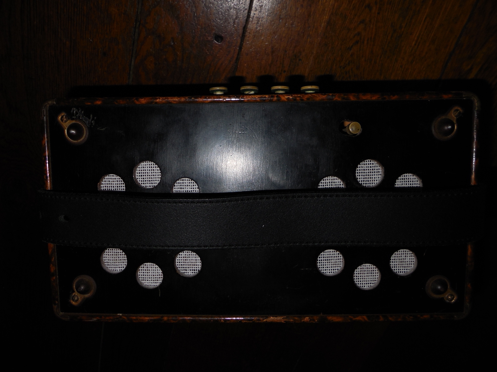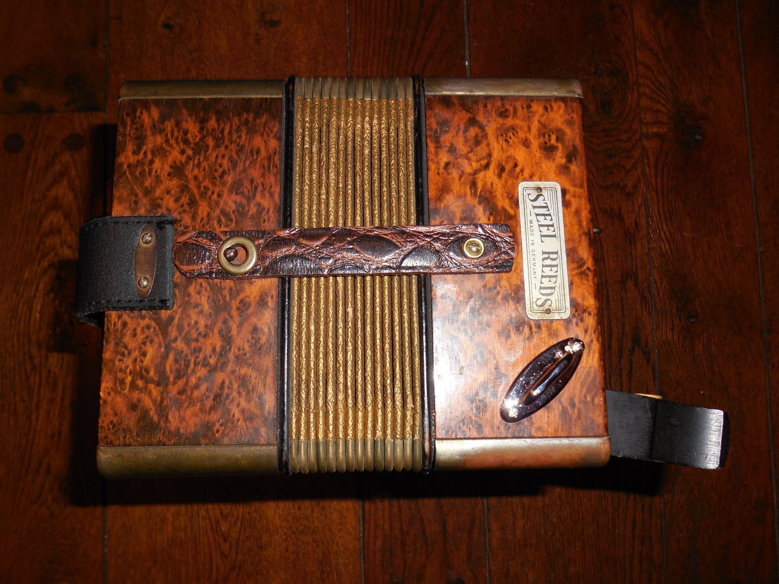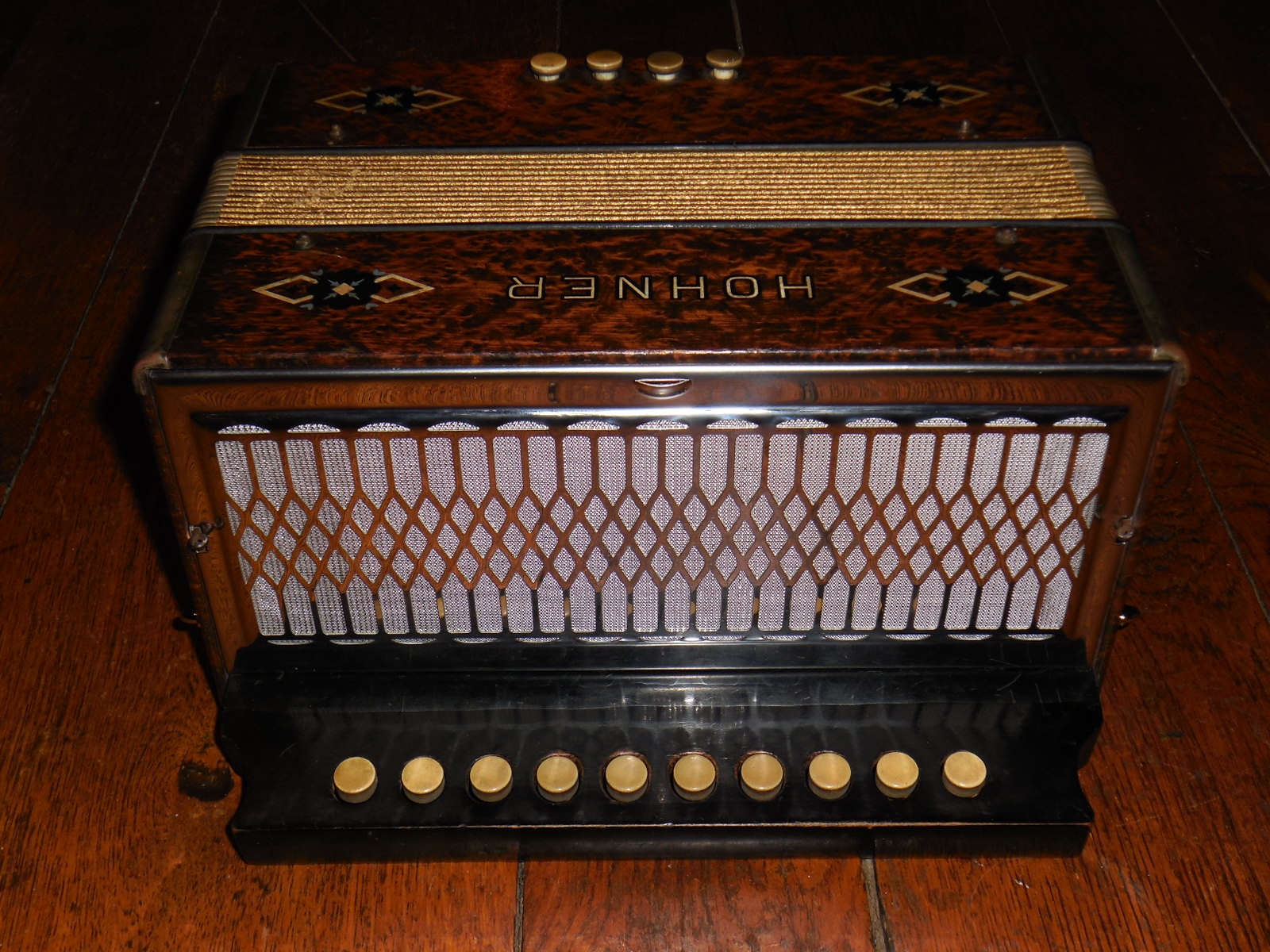 Nice Hohner pre Pokerwork Burl button accordion converted to key of D using old German reedplates. The lowest treble key was changed from a low note to an accidental per customer’s request. Work Done:
